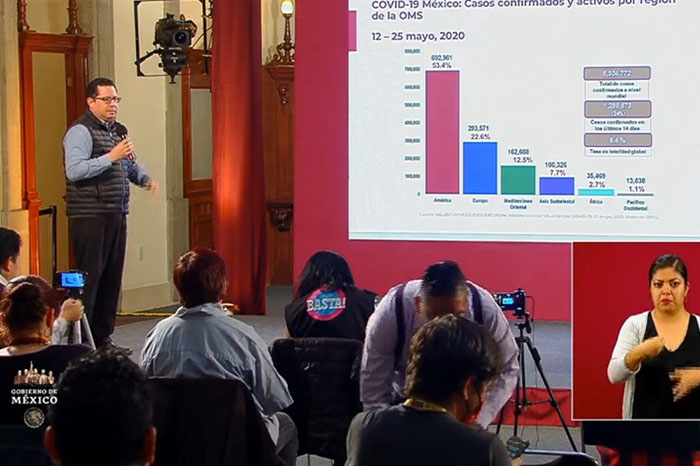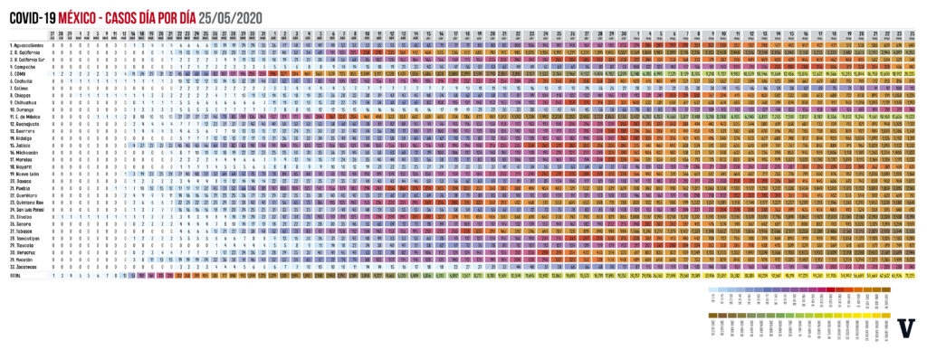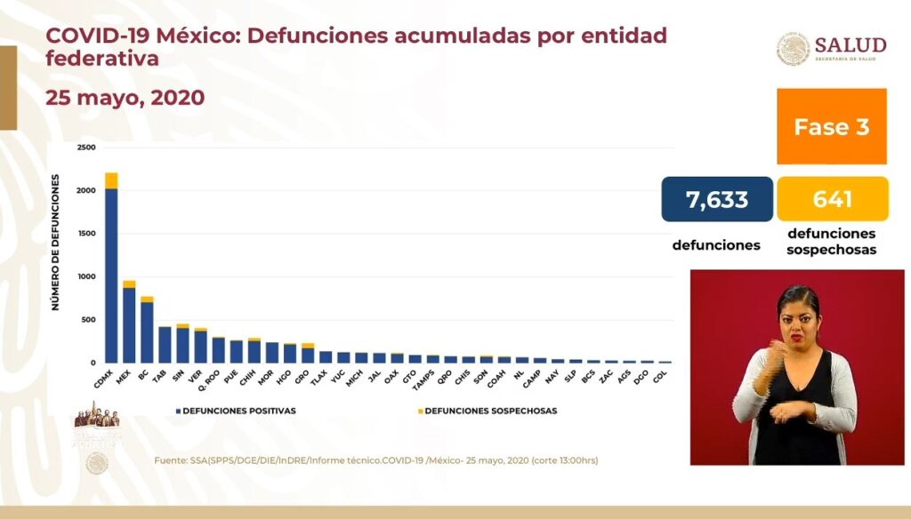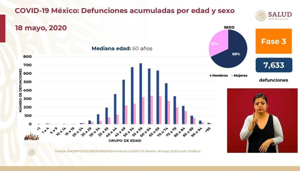 Osiris Olachea / La Voz de Michoacán Confirmados Curados Muertes México71.105.7.633CdMx20.235.51Edomex11.523.14Baja California4.250.7Tabasco3236.5Veracruz2.900.8 Ciudad de México. En las últimas 24 horas se registraron 239 defunciones por la enfermedad de COVID-19, que actualizan a 7 mil 633 el número total de muertes ocurridas en el país por complicaciones del padecimiento causado por el virus SARS-CoV-2, con lo que México llega al noveno lugar en el mundo con más fallecimientos, superando a Irán, que tiene 7 mil 451 contagios, de acuerdo con el conteo que realiza la Universidad Johns Hopkins. También en el último día se registraron 2 mil 485 contagios nuevos de COVID-19 en México, con lo que se alcanzaron los 71 mil 105 casos confirmados acumulados desde que inició la epidemia en el país, informó el doctor José Luis Alomía, director general de Epidemiología de la Secretaría de Salud federal (Ssa). De acuerdo con el Centro de Ciencia e Ingeniería de Sistemas de la Universidad de la Universidad Johns Hopkins, a nivel internacional México es el país número 17 con más casos confirmados del padecimiento, superando a Bélgica, Pakistán y Países Bajos. Fuente: Dirección General de Epidemiología. Diseño: Enrique Santiago, La Voz de Michoacán. Hasta hoy los casos activos son 14 mil 020, es decir, menos de una quinta parte de la enfermedad; como caso activo se consideran los pacientes que presentaron inicio de síntomas en las últimas dos semanas. La edad promedio de las personas que han dado positivo al nuevo virus es de 46 años y la mayoría son hombres, con 57 por ciento de los casos. Hasta hoy se han practicado pruebas de detección a 225 mil 650 personas, de las cuales 29 mil 509 se mantienen como casos sospechosos y 125 mil 036 han dado negativo. A solo unos días de que termine la Jornada Nacional de Sana Distancia la mayoría de los estados registra más de mil casos acumulados, mientras que solo 11 tienen menos de dicha cantidad, y de estos solo 5 tienen menos de 500 contagios. La tasa de prevalencia de la enfermedad respecto a los casos acumulados es de 55.6 por cada 100 mil habitantes y las entidades con más contagios positivos acumulados (es decir activos, recuperados y decesos) son: Ciudad de México (20,235)Estado de México (11,523)Baja California (4,250)Tabasco (3,236)Veracruz (2,944) Sin embargo, en cuando a los casos activos solo dos entidades tienen más de mil personas que aún presentan la enfermedad, mientras que la mayoría, 30 estados, tienen menos de mil casos. Las entidades con más casos activos (pacientes que iniciaron con síntomas en los últimos 14 días) hasta este este lunes son: Ciudad de México (3,657)Estado de México (1,422)Tabasco (606)Veracruz (600)Sinaloa (557) La tasa de incidencia nacional es de 10.9 por cada 100 mil habitantes, respecto a los casos activos, y los estados que ocupan los primeros lugares en este indicador son Ciudad de México, Tabasco, Sinaloa, Yucatán y Tlaxcala. Defunciones En cuando a las defunciones, los estados que reportan más muertes por complicaciones de la enfermedad de COVID-19 son Ciudad de México, Estado de México, Baja California, Tabasco y Sinaloa. Además de los 7 mil 633 fallecimientos de personas que dieron positivo a coronavirus, hay 641 más consideradas sospechosas, es decir, aún no se ha determinado si el paciente tenía el virus. La mayoría de las víctimas mortales de COVID-19 son hombres, con 68 por ciento de los decesos. La edad promedio de los fallecimientos en el país es de 60 años, pero el grupo de edad de 55 a 59 años es en el que se han registrado más muertes en hombres, mientras que en mujeres es de 60 a 69. Las principales comorbilidades, es decir enfermedades presentes en pacientes, en las defunciones por COVID-19 son hipertensión, diabetes y obesidad, seguidas de tabaquismo, insuficiencia renal crónica y enfermedad pulmonar obstructora crónica (EPOC). En cuando condición de caso, los pacientes hospitalizados intubados son los que más riesgo presentan, pues enfrentan 66 por ciento de letalidad. Fuente: Dirección General de Epidemiología. Diseño: Enrique Santiago, La Voz de Michoacán. Fuente: Dirección General de Epidemiología. Diseño: Enrique Santiago, La Voz de Michoacán.