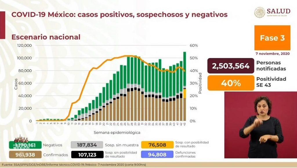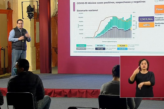 EFE / La Voz de Michoacán Ciudad de México. El Gobierno mexicano informó este sábado de un total de 94 mil 808 muertes y 961 mil 938 casos de COVID-19 al sumar 485 decesos y 6 mil 807 contagios en la última jornada. Al presentar el informe técnico diario, la Secretaría de Salud (SSa) reconoció un repunte semanal del 14 por ciento al registrar un total de 2 mil 806 en la presente semana epidemiológica, y un aumento semanal del 6 por ciento en el número de casos estimados. “Le recordamos a la población que la epidemia de COVID-19 en México continúa activa, estamos iniciando la temporada invernal, esta se va a extender todavía hasta marzo, principios de abril del próximo año", advirtió José Luis Alomía, director general de Epidemiología. Con estos datos, México es el cuarto país con más muertes acumuladas y el décimo con mayor número de contagios, de acuerdo con la Universidad Johns Hopkins. Las estadísticas también muestran que la tasa de mortalidad de México es del 9,86 %, lo que significa que fallece una de cada 10 personas diagnosticada con la nueva enfermedad, uno de los índices más altos a nivel mundial. El número de casos estimados podría ser mayor a 1.118.000 por las personas que aún esperan su prueba confirmatoria, reconoció el director de Epidemiología, aunque argumentó que solo 50.468 casos están activos, el 5 %. Además, México registró un índice de positividad de sus pruebas del 40 %, cuando la Organización Mundial de la Salud (OMS) recomienda mantener la tasa cercana al 5 %. La ocupación hospitalaria es del 33 % a nivel nacional para camas generales, con los estados de Chihuahua y Durango con una ocupación de "riesgo" por estar por encima del 70 %. EAlomía advirtió de una posible agudización de la pandemia por combinarse con la época de influenza estacional y de otras enfermedades respiratorias. "Son en los meses de diciembre, enero y febrero cuando tenemos la mayor circulación de virus respiratorios, ahora se va a integrar a esta circulación SARS-CoV-2, que produce covid-19”, manifestó. El semáforo de riesgo epidemiológico del Gobierno federal muestra que más de la mitad del territorio mexicano está en riesgo alto o máximo de contagio. Los norteños estados de Chihuahua y Durango están en color rojo, lo que significa que están en peligro máximo. Otras 18 de 32 entidades están en color naranja o riesgo alto, la mayoría en la zona del centro, norte y occidente.