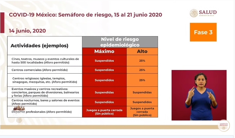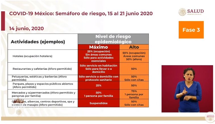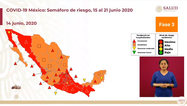 Jorge Ávila / La Voz de Michoacán Ciudad de México. Este domingo 14 de junio, México registra un acumulado de 146 mil 837 contagios de COVID-19 desde el 28 de febrero de este año, frente a 17 mil 141 defunciones desde esa fecha. A este día, hay 22 mil 398 casos aún activos. Actualmente se contabilizan 17 mil 141 muertes, informó el subsecretario de Prevención y Promoción de la Salud, Hugo López-Gatell Ramírez, en la conferencia de prensa desde Palacio Nacional de este domingo. En virtud de esos datos, el funcionario federal presentó el nuevo semáforo, el cual estará activo desde mañana lunes 15 de junio hasta el 21 de este mes. Este semáforo indica los estados con mayor riesgo, de los que 16 están en rojo y el resto en naranja. Lo anterior quiere decir que de ayer a hoy hubo 4 mil 147 contagios y 269 defunciones por COVID-19. En virtud de esos datos, el funcionario federal presentó el nuevo semáforo, el cual estará activo desde mañana lunes 15 de junio hasta el 21 de este mes. Este semáforo indica los estados con mayor riesgo, de los que 16 están en rojo y el resto en naranja, y permite saber qué actividades continuarán restringidas durante esta semana, a reserva de que los datos mejoren. Por ejemplo, Michoacán, que está con el semáforo en naranja pero con un marcado incremento en los contagios, deberá ajustar sus medidas como se indica en la siguiente gráfica: