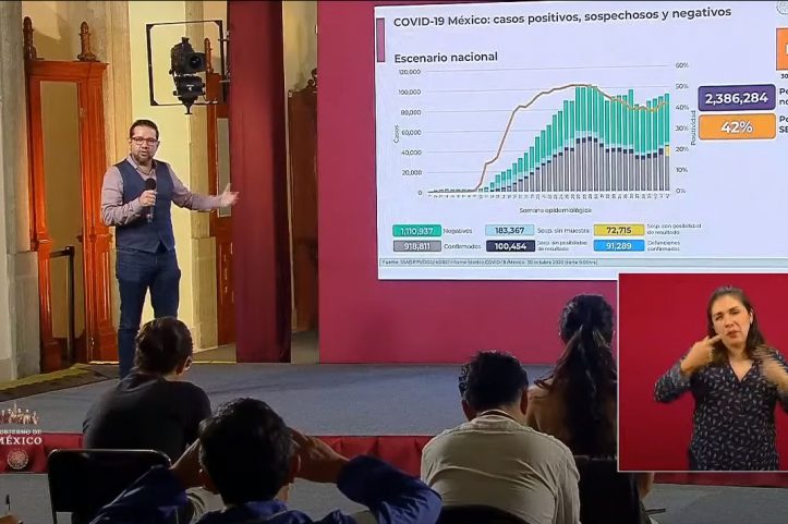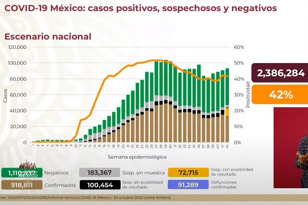 EFE / La Voz de Michoacán México. México informó este domingo de 142 muertes y de 4 mil 430 nuevos contagios, durante las últimas 24 horas, para un total de 91 mil 895 de fallecidos y 929 mil 392 casos confirmados por la covid-19 en el país, informó la Secretaría de Salud. En el informe técnico de este día, las autoridades sanitarias confirmaron aumentos porcentuales de 0,15 % en fallecimientos y de 0,47 % en contagios, en contraste con las cifras del sábado. Desde el inicio de la pandemia, el 28 de febrero, en México han sido estudiadas 2.410.306 pacientes con signos y síntomas del coronavirus y que tuvieron un índice de positividad del 38 %. Entre el universo de pacientes estudiados se tienen los 929 mil 392 que tuvieron un positivo a la infección viral, 1.126.280 con un resultado negativo y 354 mil 634 se mantienen como casos sospechosos. Las autoridades sanitarias clasifican los casos sospechosos en aquellos que no tienen una muestra, los que no hay posibilidad de tener un resultado y aquellos que si esperan conocer el diagnóstico de su prueba. En el informe se destacó que 682 mil 044 pacientes son considerados como casos recuperados. Las autoridades sanitarias tienen actualmente 15.248 muertes sospechosas que se clasifican en las que no tienen muestra (10.520), las que no tendrán un diagnóstico (4.269) y las que si lo pueden tener (459). Según el informe, las proyecciones de las autoridades apuntan a que en México hay al momento 1.078.810 casos estimados, una cifra que se obtiene de sumar los positivos más el porcentaje de sospechosos (42 %) que se piensa que darán positivo. Se apuntó que el 5 % de los casos estimados, que corresponden a 50 mil 981 representan la epidemia activa en el país, al ser pacientes que desarrollaron síntomas en los últimos 14 días. En cuanto a defunciones Ciudad de México, Estado de México, Veracruz, Puebla, Jalisco, Nuevo León, Baja California, Sinaloa, Guanajuato y Sonora son las 10 entidades que han registrado el mayor número y en conjunto representan más de la mitad (62,7 %) de todas las del país. Con 15 mil 202 decesos, la capital mexicana por sí sola, acumula el 16,5 % de todas defunciones a nivel nacional. México es el décimo país con más contagios y el cuarto con más fallecidos absolutos, de acuerdo con la Universidad Johns Hopkins. COVID-19 es la tercera causa de muerte en México, por encima de los más de 85.000 fallecidos anuales por tumores malignos, y solo por debajo de la diabetes y las enfermedades del corazón, según el Instituto Nacional de Estadística y Geografía (Inegi).