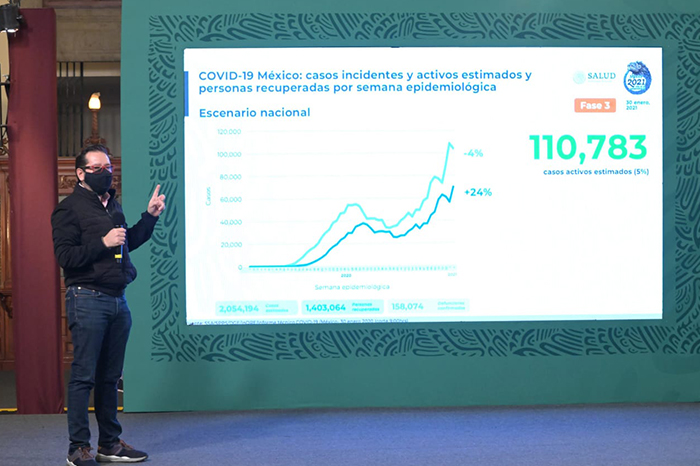 EFE / La Voz de Michoacán Ciudad de México. México registró mil 495 nuevas muertes y 15 mil 337 casos por la COVID-19 en las últimas 24 horas, para contabilizar un total de 158 mil 074 decesos y 1 millón 857 mil 230 contagios confirmados, informó este sábado su Secretaría de Salud. Con estas cifras, México ocupa el decimotercer lugar mundial en número de contagios y escaló esta semana al tercer puesto con más decesos por la pandemia, detrás de Estados Unidos y Brasil, según la Universidad Johns Hopkins. La semana pasada, el país sumó varios récords tanto en número de fallecimientos (mil 803) como de positivos (22 mil 339) en un solo día. Además, el número de casos estimados supera los 2 millones al considerar aquellos que esperan el resultado de su prueba, informó el director de Promoción de la Salud, Ricardo Cortés, en conferencia de prensa desde el Palacio Nacional. Entre ellos hay 110 mil 783 casos activos estimados, es decir, un 5 por ciento del total que ha presentado síntomas en las últimas dos semanas. https://twitter.com/HLGatell/status/1355686544816787458 Según datos aportados por Cortés, hay una ocupación media del 58 % de camas generales en los hospitales mexicanos que atienden a pacientes con COVID-19, entre los que resaltan Ciudad de México, con un 88 % de saturación, Estado de México con el 84 % y Puebla con un 80%. En las camas intensivas o con ventilador hay una ocupación nacional del 53 %, con Ciudad de México también a la cabeza con 82 % de saturación, Estado de México con 76 % y Nuevo León con 71 %. De los 32 estados de México, 13 seguirán la próxima semana en semáforo epidemiólogico rojo por alerta máxima de contagio, 17 en naranja por riesgo alto y 2 en amarillo. AMLO, CON CUADRO LEVE Sobre la salud del presidente del país, Andrés Manuel López Obrador, quien confirmó su contagio de COVID-19 el domingo pasado, Cortés aseveró que "continúa afortunadamente con un cuadro bastante leve" y cumplirá sus dos semanas de aislamiento. “(Es) un hombre que está presentando un cuadro leve y mucha tranquilidad, alegría y esperanza de recuperarse, prácticamente mañana se cumple la mitad de su periodo de aislamiento si continúa con el mismo cuadro leve”, dijo el alto funcionario de la Secretaría de Salud. Ricardo Cortés también informó de que hoy se aplicaron en el país 8 mil 090 vacunas de Pfizer y BioNTech, así como que del total de 766 mil 350 dosis recibidas se han aplicado 670 mil 307, y que entre el personal sanitario son ya 39 mil 009 quienes han recibido ambas dosis necesarias. https://twitter.com/SSalud_mx/status/1355722190524706816 El presidente mexicano anunció el viernes la llegada para febrero de otros "6 millones de vacunas y para marzo el doble". México tiene acuerdos por 34,4 millones de dosis de Pfizer, 77,4 millones de la británica AstraZeneca, 35 millones de CanSino y 51,5 millones de la plataforma Covax de la Organización Mundial de la Salud (OMS). Además, López Obrador negoció con el presidente de Rusia, Vladimir Putin, 24 millones de dosis de la fórmula rusa Sputnik V.