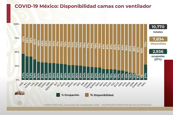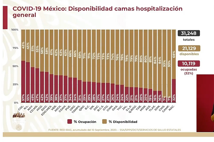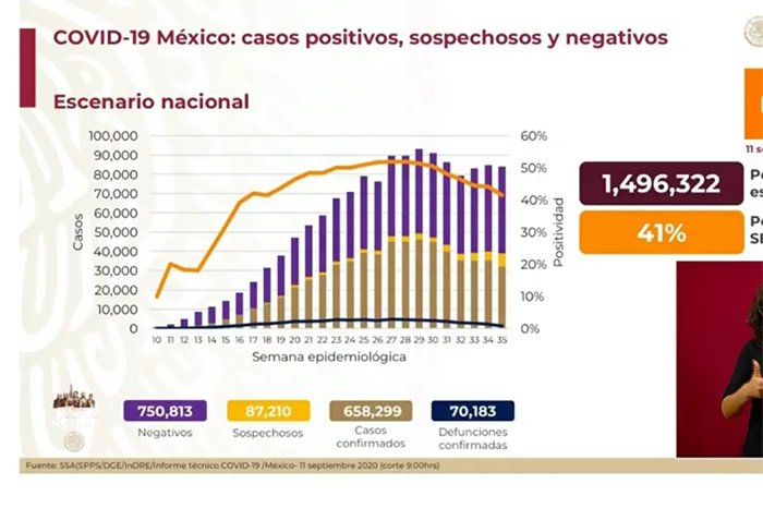 Juan Carlos Huante / La Voz de Michoacán Ciudad de México. Mientras hay un incremento de casos sospechosos, aunque la positividad de COVID-19 sigue a la baja, según la Secretaría de Salud federal, México llegó a los 658 299 de personas que se han contagiado de la enfermedad provocada por SARS-CoV-2. Al último reporte técnico se sumaron 5 mil 935 nuevos casos confirmados del coronavirus. Durante el informe sobre el curso de la epidemia dado a conocer por el doctor Ricardo Cortés Alcalá, director de Promoción de la Salud, México superó las 70 mil muertes, al acumular hasta este viernes 70 mil 183, de las cuales 539 se agregaron al registro total en el último corte. A la fecha, de acuerdo con los datos de la Secretaría de Salud, en México se han estudiado 1.4 millones de personas catalogadas como sospechosas de contraer el virus, y actualmente mantienen este estatus 87 mil 210 casos. Del total de personas que han enfermado, 463 mil 746 se han recuperado y mantienen la epidemia activa 41 mil 025 en los últimos 14 días. Ricardo Cortés celebró que los casos estimados de contagios y defunciones van a la baja, al plantearse 692 mil 732 y 71 mil 885, respectivamente. En infraestructura hospitalaria, con camas para pacientes con la enfermedad respiratoria aguda grave, pero que no necesitan intubación, hay una disponibilidad de 21 mil 129 de un total de 31 mil 248 a nivel nacional. Colima registra la mayor ocupación, con 57%, y Chiapas, la menor, con 32%. Respecto a las camas para personas enfermas de COVID-19 que sí necesitan el oxígeno suplementario existe una ocupación de 2 mil 936 de 10 mil 770 que se han dispuesto. La entidad chiapaneca es la que reporta la mayor disponibilidad en un 73%, y en mayor porcentaje está Aguascalientes, con el 47% de su total.