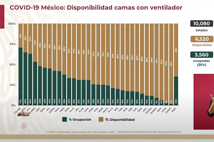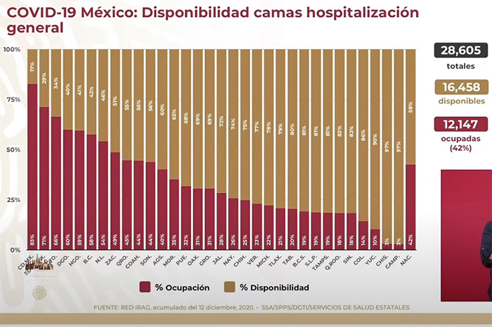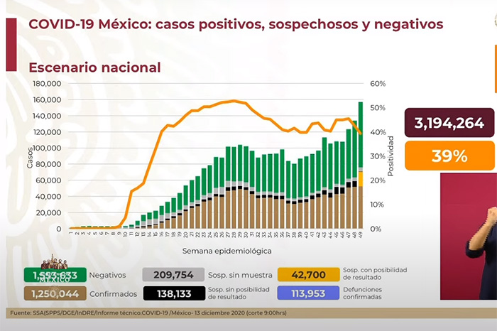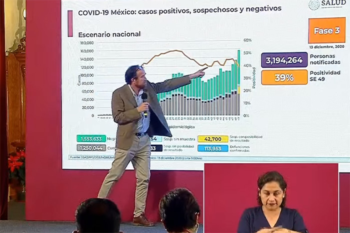 EFE / La Voz de Michoacán México. La Secretaría de Salud de México informó este sábado de que el país sumó 8 mil 608 enfermos y 249 decesos nuevos de COVID-19, con lo que acumula ya 1,250,044 contagios y 113 mil 953 muertos confirmados desde el inicio de la pandemia en febrero pasado. México cierra así una semana en la que varios días ha sumado más de 11 mil contagios, las cifras más altas de la pandemia salvo por el 5 de octubre, cuando se añadieron 28 mil 115 nuevos casos, aunque en ese momento fue por un cambio metodológico con infecciones retrasadas. De acuerdo con el recuento de la Universidad Johns Hopkins, México es el decimotercer país con más casos y el cuarto con más muertes acumuladas por el nuevo coronavirus SARS-CoV-2, solo por detrás de Estados Unidos, Brasil y la India. En conferencia de prensa, Ruy López, director general del Centro Nacional de Programas Preventivos y Control de Enfermedades (Cenaprece), dijo que "hay una gran actividad" en "la transmisión y confirmación de casos", y aseguró que "una parte muy importante se explica por la Ciudad de México". Los hospitales de la capital registran una ocupación del 83 % de las camas de atención general y el 71 % de las camas con ventilador para la respiración asistida. La jefa de Gobierno de la Ciudad de México, Claudia Sheinbaum, advirtió el viernes de que la ciudad se encuentra en "alerta" por un "crecimiento muy acelerado en las hospitalizaciones", y pidió a los ciudadanos cancelar las fiestas navideñas. El subsecretario de Salud Hugo López-Gatell, encargado de la estrategia contra el coronavirus, aseguró que el país experimenta "el segundo pico" de la pandemia, con un ascenso de contagios en el centro y el norte del país, incluida la capital. La Comisión Federal para la Protección contra Riesgos Sanitarios (Cofepris) autorizó el viernes el uso de emergencia de la vacuna de Pfizer y BioNTech, y el Gobierno planea iniciar la vacunación del personal sanitario este mismo mes.