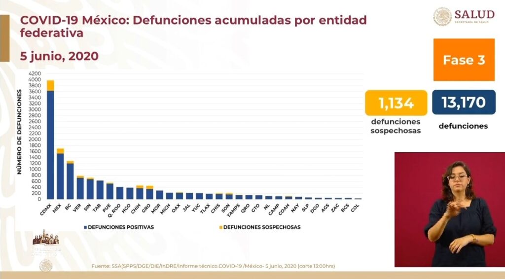 Osiris Olachea / La Voz de Michoacán Ciudad de México. Este viernes la Secretaría de Salud federal (Ssa) registró 4 mil 346 nuevos contagios de COVID-19, con lo que suman 110 mil 026 positivos en total en país, informó el director General de Epidemiología, José Luis Alomía Zegarra en la conferencia de prensa de este día. Hasta hoy han muerto 13 mil 170 personas por complicaciones de la enfermedad causada por el virus SARS-CoV-2, de las cuales 625 decesos se notificaron en las últimas 24 horas, aunque eso no significa que todas ocurrieron en ese lapso de tiempo, indicó el funcionario. Recordó que tanto los nuevos contagios como las defunciones dadas a conocer diariamente en Palacio Nacional son los casos confirmados por los estados en las últimas 24 horas, pero pudieron ocurrir días antes. De los más de 110 mil casos positivos de coronavirus en el país, solo 19 mil 015 continúan activos, de los cuales, 4 mil 300 le corresponden a la Ciudad de México, 2 mil 442 al Estado de México y 940 a Jalisco. Fuente: Dirección General de Epidemiología de la Secretaría de Salud. Diseño: Enrique Santiago, La Voz de Michoacán. El número de personas a las que se han practicado estudios para detectar si tienen el virus es de 324 mil 897, de las cuales 48 mil 822 continúan como sospechosos y 166 mil 049 obtuvieron un resultado negativo, es decir, no contrajeron el patógeno. La mayoría de casos acumulados se ubica en la zona conurbada del Valle de México (Ciudad de México-Estado de México) y Baja California. La incidencia calculada respecto a los casos acumulados es de 86.1 por cada 100 mi habitantes. La mayoría de los estados tienen entre mil y 3 mil positivos, seis entidades tienen menos de mil y siete tienen más de 3 mil. La capital mexicana reportó 29 mil 580 casos acumulados, 8 mil 358 sospechosos y 34 mil 669 negativos. En seguida, el Estado de México acumuló 17 mil 815 pacientes infectados, 8 mil 158 casos sospechosos y ha descartado el virus en 20 mil 837 personas. Baja California dio cuenta de 5 mil 784 contagios acumulados, mil 084 muestras en análisis y 3 mil 372 casos descartados. En cuanto a los casos activos, Jalisco escaló a la tercera posición con más contagios, al reportar 940, solo antes de la Ciudad de México (4,300 activos) y el Estado de México (2,442), que desde el inicio de la epidemia han concentrado la mayoría de casos. La tasa de incidencia actual respecto a los casos activos es de 14.9 por cada 100 mil habitantes, superior a la registrada hace dos semanas, que era de 10.4, de acuerdo con el corte presentado hoy. Los estados con la mayor incidencia de casos activos son Ciudad de México, Tabasco, Aguascalientes, Sinaloa, Quintana Roo y Yucatán. Defunciones De los 13 mil 170 fallecimientos por coronavirus en México, 3 mil 631 ocurrieron en la Ciudad de México, mil 531 en el Estado de México y mil 200 en Baja California. De acuerdo con el reporte nacional, con corte a las 13:00 horas de este viernes, en Veracruz, 721 personas han perdido la vida, 673 en Sinaloa, 626 en Tabasco, 525 en Puebla, 411 en Quintana Roo, 386 en Hidalgo, 376 en Chihuahua, 347 en Guerrero y 295 en Morelos. Dicho conteo, prosigue Michoacán con 220 muertes, 215 en Oaxaca, 213 en Jalisco, 207 en Yucatan, 183 en Tlaxcala, 176 en Chiapas, 165 en Sonora, 140 en Tamaulipas y 139 en Querétaro. Guanajuato dio cuenta de 134 decesos, Nuevo León de 109, Campeche de 103, Coahuila de 91, Nayarit de 81, San Luis Potosí 62, Durango 49, Aguascalientes 48 y Zacatecas 43. Por último, Baja California Sur contabilizó 41 fallecimientos, en tanto que Colima mantuvo la cifra en 29. Con información de Notimex Fuente: Dirección General de Epidemiología de la Secretaría de Salud. Diseño: Enrique Santiago, La Voz de Michoacán. Fuente: Dirección General de Epidemiología de la Secretaría de Salud. Diseño: Enrique Santiago, La Voz de Michoacán.