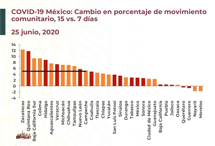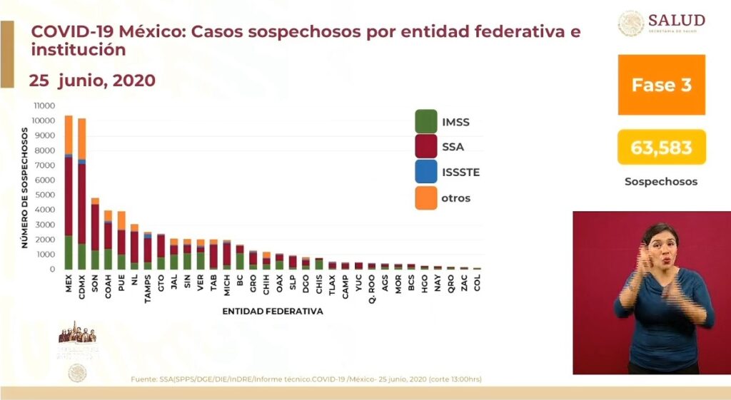 Confirmados Recuperados Muertes México202,951116,86225,060CdMx45,125/6,116EdoMex32,017/3,873Tabasco9,486/970Veracruz9,161/1,395Puebla9,014/1,101 Osiris Olachea / La Voz de Michoacán Ciudad de México. En cuatro meses de epidemia, México rebasó la barrera de los 200 mil casos de COVID-19, pues este jueves, día 25 de la Nueva Normalidad, el país llegó a 202 mil 951 habitantes positivos a coronavirus, 6 mil 104 más que ayer, informó el titular de la Dirección General de Epidemiología de la Secretaría de Salud federal (Ssa), José Luis Alomía Zegarra, en la conferencia de prensa de hoy en Palacio Nacional. Con los 6 mil 104 contagios registrados en las últimas 24 horas, México superó a Francia en casos positivos del virus SARS-CoV-2, pues ese país tiene 197 mil 885, de acuerdo con el conteo global que lleva en tiempo real la Universidad Johns Hopkins. Apenas ayer miércoles México había rebasado a Alemania en el número de contagios, por lo que en dos días avanzó dos lugares en el ranking mundial y hoy se ubica como el país número 11 con más personas infectadas con coronavirus en el mundo. También en las últimas 24 horas se registraron en México 736 nuevas defunciones de pacientes que tenían COVID-19, con lo que el país llegó a 25 mil 060 defunciones, además de mil 966 fallecimientos que ahora permanecen como sospechosos, en espera de que se determine si la causa de muerte está relacionada con coronavirus. Fuente: Dirección General de Epidemiología de la Ssa. Diseño: Enrique Santiago, La Voz de Michoacán. Alomía Zegarra aclaró que tanto los contagios como las muertes que se notificaron hoy ocurrieron en los últimos días, pero este jueves se confirmaron como positivas al virus SARS-CoV-2. Detalló que de los 736 decesos 409 se dieron en hospitales del IMSS, 197 en instituciones de la Secretaría de Salud y 130 en otros. Apuntó que los casos activos son 25 mil 529, que representan menos de la séptima parte de los casos acumulados en todo el país. El director general de Epidemiología precisó que, de los casos confirmados y sospechosos, los estados con mayor incidencia son la Ciudad de México, el Estado de México y Tabasco. Sin embargo, con casos sospechosos son Estado de México, Ciudad de México, Sonora, Coahuila y Puebla los que lideran la lista. Alomía Zegarra indicó que además hay 40 mil 914 casos sospechosos de seguir activos, en la Ciudad de México, Estado de México, Puebla y Guanajuato, principalmente. Hasta hoy se han recuperado a la enfermedad 116 mil 862 personas en el país, que representan 57 por ciento del total de casos confirmados. Respecto a la ocupación hospitalaria, de 27 mil 342 camas generales para pacientes con COVID-19 en el país, 12 mil 224 están ocupadas y la Ciudad de México y Estado de México, ambos con 65 por ciento, son lo que tienen más personas hospitalizadas, seguidos de Sonora, Puebla y Guanajuato. En las camas para pacientes críticos, es decir las que cuentan con ventilar para respiración asistida, de las 9 mil 201 que hay en el país 3 mil 446 están ocupadas; Baja California, Estado de México, Ciudad de México, Sonora y Nuevo León son las entidades que reportan mayor ocupación. Aumenta movilidad Más de la mitad del país aumentó su movilidad durante la última semana, de acuerdo con el reporte presentado hoy por el director general de Promoción de la Salud, Ricardo Cortés Alcalá. Según el informe, que tiene base en datos de usuarios de Twitter, Google y Facebook, 28 entidades federativas incrementaron su movilidad en los últimos 7 días. Zacatecas, Quintana Roo, Baja California Sur, Colima, Hidalgo, Aguascalientes, Veracruz, Michoacán, Chihuahua, Tamaulipas, Nuevo León y Campeche son las entidades que incrementaron la movilidad más de 5 por ciento. Epidemia será larga, reitera Gatell El subsecretario de Prevención y Promoción de la Salud, Hugo López-Gatell Ramírez, reiteró que la epidemia en México será larga, en defensa a las notas de prensa que retomaron sus dichos sobre que la epidemia terminaría este 25 de junio, que pronunció el pasado 16 de abril. El funcionario presentó un video donde se le escucha, en distintas fechas y desde febrero, mencionar que la epidemia sería larga, y luego, en el video del 16 de abril, aclara que la predicción de fin de la epidemia sería "si y sólo si" se cumplía con las medidas de confinamiento. "No asumimos que los comunicadores, o sus editores, o sus jefes de prensa, o los dueños de los medios de comunicación -que son quienes finalmente definen las agendas de estos medios- tengan mala voluntad". https://twitter.com/HLGatell/status/1276311169767223307 "Supongamos que hay una mala interpretación de la información. Esperemos que esta les llegue, quizá no vean la conferencia de prensa diaria de Covid-19, pero alguien les hará llegar esto y a lo mejor ahí van a decir, ‘ah no, sí se había dicho’", expresó. El funcionario dijo entender que mantener las medidas de mitigación "es fatigoso, incómodo, desagradable" y "causa ansiedad", pero pidió a la población ser pacientes, pues la epidemia podría extenderse hasta octubre. Fuente: Dirección General de Epidemiología de la Ssa. Diseño: Enrique Santiago, La Voz de Michoacán. Fuente: Dirección General de Epidemiología de la Ssa. Diseño: Enrique Santiago, La Voz de Michoacán.