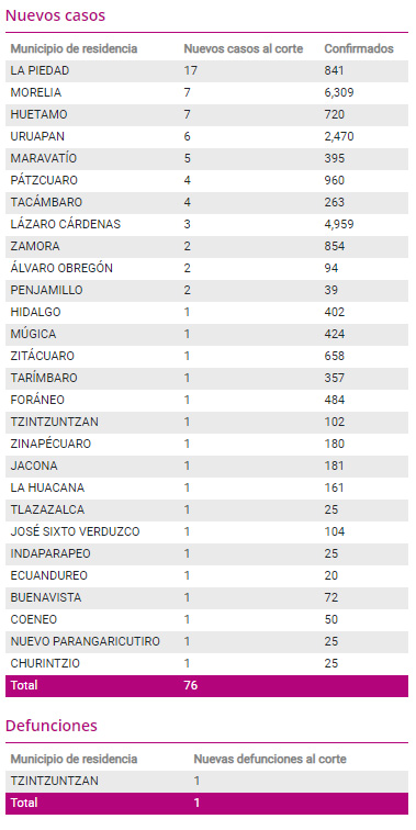 Casos acumuladosConfirmadosRecuperadosMuertesMorelia6,3095,483452Lázaro Cárdenas4,9594,604290Uruapan2,4702,192232Pátzcuaro96084766Zamora85474682Apatzingán83175161 La Voz de Michoacán te presenta todas las noches el último reporte de la Secretaría de Salud de casos de COVID-19 Juan Carlos Huante / La Voz de Michoacán Morelia, Michoacán. Ahora no fue Morelia el municipio con el mayor número de casos diarios, sino La Piedad, que al corte de este lunes agregó a su registro 17 nuevos contagios. En total en el territorio estatal se reportaron 76 nuevos pacientes con la enfermedad del virus SARS-CoV-2, para un acumulado de 26 mil 962, y en decesos, con uno adicional, suma 2 mil 137. La muerte reportada este 16 de noviembre ocurrió en Tzintzuntzan, mientras que de los nuevos casos positivos, después del municipio piedadense, Morelia y Huetamo registraron siete cada uno, y Uruapan, seis. Por demarcación municipal, Morelia sigue como centro de la epidemia en el estado, al acumular 6 mil 309 enfermos y 452 muertes, pero 5 mil 483 recuperados. Le siguen Lázaro Cárdenas y Uruapan, que pasaron de alto riesgo a moderado (bandera verde). El puerto michoacano suma en sus registros 4 mil 959 contagios y 290 fallecimientos; y Uruapan, 2 mil 470 y 232, respectivamente. El reporte estatal sobre COVID-19 detalla que se han recuperado 23 mil 713 personas que contrajeron el coronavirus, y actualmente se encuentran clasificados como sospechosos mil 230 casos y mil 112 mantienen la epidemia activa durante los últimos 21 días. Además, los datos muestran que durante el transcurso de la emergencia sanitaria se les ha tomado una prueba de detección a 64 mil 343 personas. Por rangos de edad, la mayor incidencia de casos confirmados recae en quienes tienen de 30 a 39 años, con 3 mil 003 mujeres y 3 mil 137 hombres que se infectaron de COVID-19. Pero el mayor número de defunciones ha ocurrido en el grupo de 60 a 69 años (247 mujeres y 360 hombres.