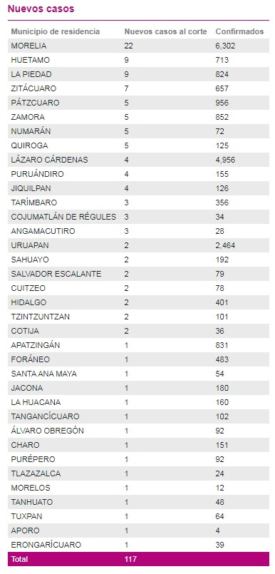 Casos acumuladosConfirmadosRecuperadosMuertesMorelia6,3025,445452Lázaro Cárdenas4,9564,598290Uruapan2,4642,188232Pátzcuaro95684466Zamora85274582Apatzingán83174661 La Voz de Michoacán te presenta todas las noches el último reporte de la Secretaría de Salud de casos de COVID-19 Juan Carlos Huante / La Voz de Michoacán Morelia, Michoacán. Con 117 nuevos casos positivos agregados al registro estatal este domingo, Michoacán rebasó la cifra de los 26 mil 800, al acumular 26 mil 886 contagios de COVID-19. Y con una muerte más, la entidad alcanzó la cifra de 2 mil 136. El único fallecimiento ocurrió en el municipio de Zacapu. Morelia reportó nuevamente el mayor número de casos diarios, al contabilizar 22 este 15 de noviembre, para un acumulado total de 6 mil 302 personas que han enfermado con el virus SARS-CoV-2, aunque también es alta la cifra de recuperados, con 5 mil 445. Por su parte, Huetamo y La Piedad fueron los otros dos municipios con más contagios nuevos, al notificar 9 cada uno. A la fecha, Morelia es el único municipio que se mantiene en bandera amarilla (alto riesgo), mientras que Lázaro Cárdenas y Uruapan pasaron a verde. En el puerto michoacano se contabilizan 4 mil 956 casos confirmados y 290 decesos; Uruapan suma 2 mil 464 y 232, respectivamente. De acuerdo con el reporte estatal de la epidemia de COVID-19, se han recuperado 23 mil 605 personas; mil 297 casos se encuentran en estudio como sospechosos y mil 145 pacientes enfermos mantienen la epidemia activa durante los últimos 21 días. En lo que lleva de transcurrida la emergencia sanitaria a causa de esta nueva cepa de coronavirus, en la entidad se han tomado 64 mil 233 pruebas para confirmar o descartar la enfermedad. En cuanto a la incidencia por rango de edad, las personas de 30 a 39 años son las que más han enfermado (3,001 mujeres y 3,134 mujeres); pero de 60 a 69 años son los que más han perdido la vida (247 mujeres y 360 hombres.