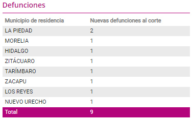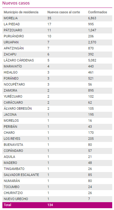Casos acumuladosConfirmadosRecuperadosMuertesMorelia6,8635,974491Lázaro Cárdenas5,0824,708301Uruapan2,5702,275249Pátzcuaro1,04791769La Piedad99585547Zamora89578189 Juan Carlos Huante / La Voz de Michoacán Morelia, Michoacán. Con la capital michoacana como el municipio con más casos diarios al corte de este jueves 3 de diciembre, Michoacán llegó a la cifra de 28 mil 890 contagios del virus SARS-CoV-2. En total, son 134 los nuevos enfermos que se agregaron al registro estatal, de los cuales, el municipio de Morelia notificó 35; seguido de La Piedad, con 17; Pátzcuaro, con 19, y Puruándiro, con 10. Sobre los fallecimientos a causa de la enfermedad de COVID-19, la entidad suma 2 mil 322; las 9 adicionales ocurrieron en La Piedad (2) y Morelia, Hidalgo, Zitácuaro, Tarímbaro, Zacapu, Los Reyes y Nuevo Urecho, con una, respectivamente. La capital michoacana, centro de la epidemia en el estado, suma a la fecha 6 mil 863 contagios y 491 decesos, y se han recuperado 5 mil 974 personas que contrajeron la enfermedad. Por su parte, La Piedad, que junto con Morelia son los dos municipios que se mantienen en bandera amarilla, con alto nivel de riesgo, continúa con una tendencia al alza en la positividad, al acumular a la fecha 995 casos. Por su parte, Pátzcuaro también engrosó su lista, pues con los 11 nuevos casos confirmados, alcanzó la cifra de mil 47. Lázaro Cárdenas es la segunda demarcación con la mayor incidencia de COVID-19 en el estado, con 5 mil 82 contagios y 301 muertes; luego está Uruapan, con 2 mil 570 y 247, respectivamente. De acuerdo a los datos proporcionados por la autoridad sanitaria de la entidad, a la fecha se han recuperado 25 mil 284 personas y se han tomado 69 mil 276 pruebas de diagnóstico para confirmar o descartar el virus. Asimismo, hay mil 908 casos clasificados como sospechosos en espera de un resultado y actualmente mantienen la epidemia activa mil 284 enfermos.