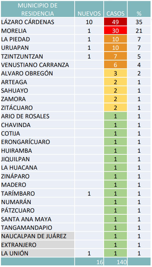 Osiris Olachea / La Voz de Michoacán Morelia, Michoacán. En el último día se registraron 16 contagios más de la enfermedad de COVID-19, así como otra muerte, con lo que suman 140 casos confirmados y 18 defunciones en Michoacán, informó el Comité Estatal de Seguridad en Salud, integrado por autoridades estatales y federales para la atención de la pandemia por el virus del SARS-CoV-2 en la entidad. Los casos positivos reportados hoy corresponden a los municipios de Lázaro Cárdenas, donde hay 10 nuevos contagios, Morelia, Tarímbaro, La Piedad, Uruapan y Tzintzuntzan, todos con un caso nuevo, así como La Unión, en el Estado de Guerrero, con un caso también. Lázaro Cárdenas continúa como el municipio con más casos, al registrar 49 acumulados, equivalente a 35 por ciento de todos los casos detectados en el estado, seguido de Morelia, con 30 contagios acumulados, y luego Uruapan y La Piedad, con 10 casos cada uno. Fuente: Departamento de Epidemiología de la Secretaría de Salud. Diseño: Enrique Santiago y Elizabeth Zavala, La Voz de Michoacán. Hasta hoy existen contagios en 25 municipios del estado y el más reciente añadido a la lista es Tarímbaro, donde hasta ayer no había casos confirmados. De los 140 casos confirmados acumulados, 32 se han recuperado y 18 han fallecido, por lo que 90 aún tienen la enfermedad activa, y de estos 20 se encuentran hospitalizados, 12 de ellos en estado grave. Los pacientes positivos son 86 hombres y 54 mujeres, en un rango de 2 años el más joven a 88 años la persona de mayor edad. Hasta hoy se reportan 195 pacientes sospechosos, de un total de 1,121 personas estudiadas en la entidad. Fuente: Departamento de Epidemiología de la Secretaría de Salud.