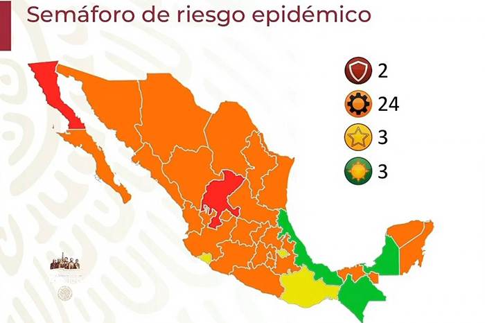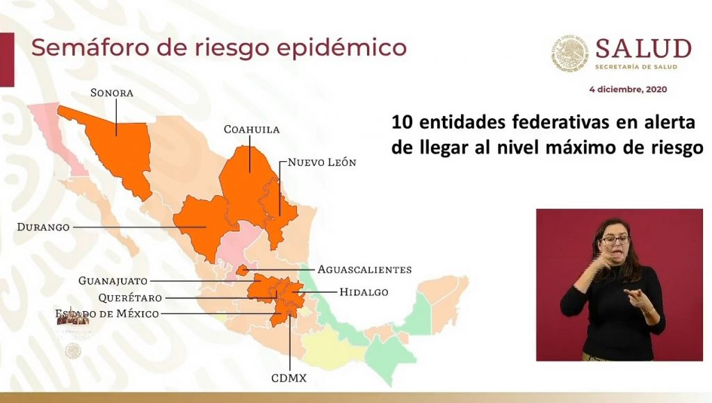 Osiris Olachea / La Voz de Michoacán Ciudad de México. Michoacán aumentó el riesgo de contagio de COVID-19 en el Semáforo de Riesgo Epidemiológico de la Secretaría de Salud federal (Ssa), al pasar de amarillo (riesgo medio) a naranja (riesgo alto) en esta herramienta elaborada por el gobierno federal. Esta noche, las autoridades sanitarias en México dieron a conocer la actualización del Semáforo que estará vigente a partir del próximo lunes y durante las próximas dos semanas, hasta el domingo 20 de diciembre. En la conferencia de prensa de esta noche desde Palacio Nacional, el director de Promoción de la Salud de México, Ricardo Cortés Alcalá, dio a conocer que la mayor parte del país está en riesgo alto, pues 24 entidades están en color naranja; 3 en verde o riesgo bajo (Campeche, Chiapas y Veracruz); 3 en amarillo, que marca riesgo medio (Colima, Oaxaca y Tlaxcala) y 2 en rojo, que es riesgo máximo (Baja California y Zacatecas). Remarcó que 10 estados que están en naranja están en alerta de llegar al máximo nivel de riesgo y podrían llegar al rojo: Ciudad de México, Sonora, Coahuila, Durango, Nuevo León, Guanajuato, Querétaro, Estado de México, Aguascalientes e Hidalgo. En el caso de Michoacán, luego de pasar las últimas cuatro semanas en amarillo o riesgo medio, la entidad pasó a naranja, que eleva a alto su nivel de contagio de COVID-19. México abrió así su séptimo mes del periodo de Nueva Normalidad, que se inició en junio y que opera con base en un semáforo epidemiológico de cuatro colores que regula la apertura de actividades económicas y sociales. Rojo: riesgo máximo Baja CaliforniaZacatecas Naranja: riesgo alto Baja California SurSonoraChihuahuaCoahuilaNuevo LeónTamaulipasSinaloaDurangoSan Luis PotosíNayaritJaliscoAguascalientesGuanajuatoQuerétaroHidalgoGuerreroMorelosEstado de MéxicoCiudad de MéxicoPueblaTabascoMichoacánYucatánQuintana Roo Amarillo: riesgo medio ColimaOaxacaTlaxcala Verde: riesgo bajo CampecheChiapasVeracruz
