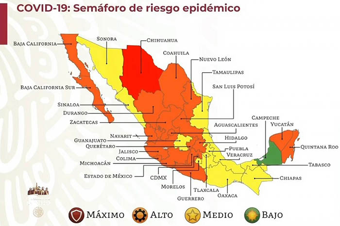Redacción / La Voz de Michoacán Ciudad de México. A partid del próximo lunes, Michoacán regresará al color naranja, es decir riesgo alto, en el Semáforo de Riesgo Epidémico de la Secretaría de Salud federal, luego de permanecer dos semanas en color amarillo, que representa riesgo medio. Así lo informó el doctor Ricardo Alcalá, director de Promoción de la Salud, al presentar esta noche la actualización de esta herramienta del gobierno federal, que estará vigente durante las próximas dos semanas, a partir del lunes 26 de octubre. Entre los cambios que sufre el semáforo están una entidad (Chihuahua) que incrementa su riesgo de alto a máximo; 5 estados —entre ellos Michoacán— pasan de amarillo a naranja, es decir de riesgo moderado a alto; 2 entidades reducen su riesgo de alto a moderado (naranja a amarillo) y 24 estados permanecen sin cambios. Entonces, con la actualización de esta noche el semáforo señala: Riesgo máximo Chihuahua Riesgo alto AguascalientesBaja CaliforniaBaja California SurCiudad de MéxicoColimaCoahuilaDurangoEstado de MéxicoGuerreroHidalgoJaliscoMichoacánNayaritNuevo LeónQuerétaroQuintana RooSan Luis PotosíYucatánZacatecas Riesgo medio ChiapasGuanajuatoMorelosOaxacaPueblaSinaloaSonoraTabascoTamaulipasTlaxcalaVeracruz Riesgo bajo Campeche México está a una semana de cumplir su quinto mes de la llamada "nueva normalidad", que inició en junio y que opera con base en el semáforo epidemiológico de cuatro colores que regula la apertura de actividades económicas y sociales. Ricardo Alcalá reveló que, si se mantienen la tendencia de aumento de contagios en diferentes entidades, estados como Coahuila, Durango y Nuevo León, en el norte del país, podrían regresar al color rojo. Actualmente la COVID-19 es la cuarta causa de muerte en México, solo por debajo de las enfermedades del corazón, la diabetes y los tumores malignos, según cifras del Instituto Nacional de Estadística y Geografía (Inegi).