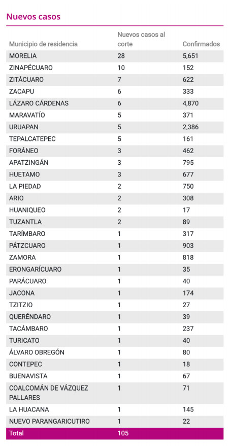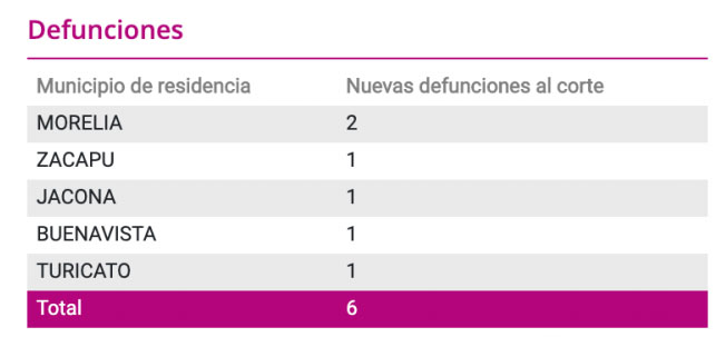 Casos acumuladosConfirmadosRecuperadosMuertesMorelia5,6514,883416Lázaro Cárdenas4,8704,476281Uruapan2,3862,064222Pátzcuaro90379464Zamora81870779Apatzingán79570359 La Voz de Michoacán te presenta todas las noches el último reporte de la Secretaría de Salud de casos de COVID-19 Juan Carlos Huante / La Voz de Michoacán Morelia, Michoacán. Con 105 nuevos casos confirmados que se agregaron al registro estatal al corte de este lunes, Michoacán suma 25 mil 293 contagios por COVID-19. Mientras que en decesos, con 6 ocurridos durante las últimas 24 horas, se alcanzó la cifra de 2 mil 11. Los nuevos fallecimientos notificados ocurrieron en Morelia (2), Buenavista (1), Jacona (1), Zacapu (1) y Turicato (1). Al registrar 28 nuevos pacientes con la enfermedad, Morelia se mantiene como el municipio con la mayor incidencia de contagios, al sumar 5 mil 651, cantidad que representa el 22.3% del total casos acumulados en Michoacán. Por su parte, Lázaro Cárdenas agregó a su padrón este lunes 6 personas enfermas, para un total de 4 mil 870, y Uruapan, 5, que suma 2 mil 386. En pérdidas de vida a causa de la enfermedad provocada por SARS-CoV-2, Morelia también encabeza la lista con el mayor porcentaje de letalidad, 20.6% del acumulado total en el estado, al sumar hasta este lunes 416. Le siguen Lázaro Cárdenas, con 281 muertes, y Uruapan, con 222. De las personas que han enfermado por COVID-19, 22 mil 83 se han recuperado y actualmente mantienen la epidemia activa durante 21 días mil 199. Además, se encuentran en análisis como sospechosos en espera de resultado mil 287 casos. En lo que va de la emergencia sanitaria debido a la pandemia del coronavirus, en la entidad se han tomado 60 mil 702 muestras a pacientes que presentaron síntomas similares a los causados por COVID-19. Por grupos de edad, quienes más se han contagiado tienen entre 30 y 39 años (2 mil 180 mujeres y 2 mil 968 hombres). En tanto, en el rango de los 60 a 69 años se presenta la mayor incidencia de letalidad (233 mujeres y 338 hombres).