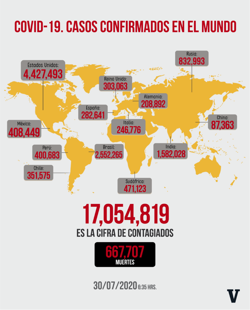 Enrique Santiago / La Voz de Michoacán Morelia, Michoacán La pandemia de COVID-19 mantiene en vilo al mundo. Tres naciones rebasan el millón de casos: en primer lugar se mantiene EUA, con 4,427,493, le sigue Brasil con 2,552,265 y en tercer lugar, India con 1,582,028. Te presentamos un panorama global actualizado al 30 de julio de 2020 sobre el comportamiento del COVID-19. Fuente: Johns Hopkins University of Medicine. Diseño: Enrique Santiago, La Voz de Michoacán. Comienza a preocupar el cúmulo de contagios en la India: suman casi 100 mil casos en dos días. En Estados Unidos y Brasil, aunque siguen aumentando los contagios, ya es en mucho menor escala incluso que México. Fuente: Dirección General de Epidemiología de la Ssa. Diseño: Enrique Santiago, La Voz de Michoacán. En México aumentan los casos aún de manera alarmante, sobre todo en la capital y el Estado de México. Sumados los casos de la Ciudad y el Estado de México son 122,851 superando la cifra de contagios que presenta Canadá. Michoacán alcanzó los 9 mil 555 contagios. Morelia y Pátzcuaro, ahora son el "epicentro" de la pandemia. Morelia, con 37 casos nuevos y Pátzcuaro, con 28, son los municipios que más casos acumularon el último día. Por el contrario, Lázaro Cárdenas no sumó ningún caso nuevo. Sin embargo, ya sólo quedan cuatro municipios libres de COVID-19: este día Acuitzio presentó sus dos primeros casos.