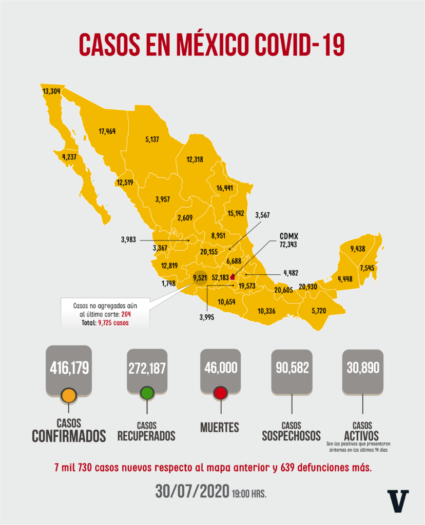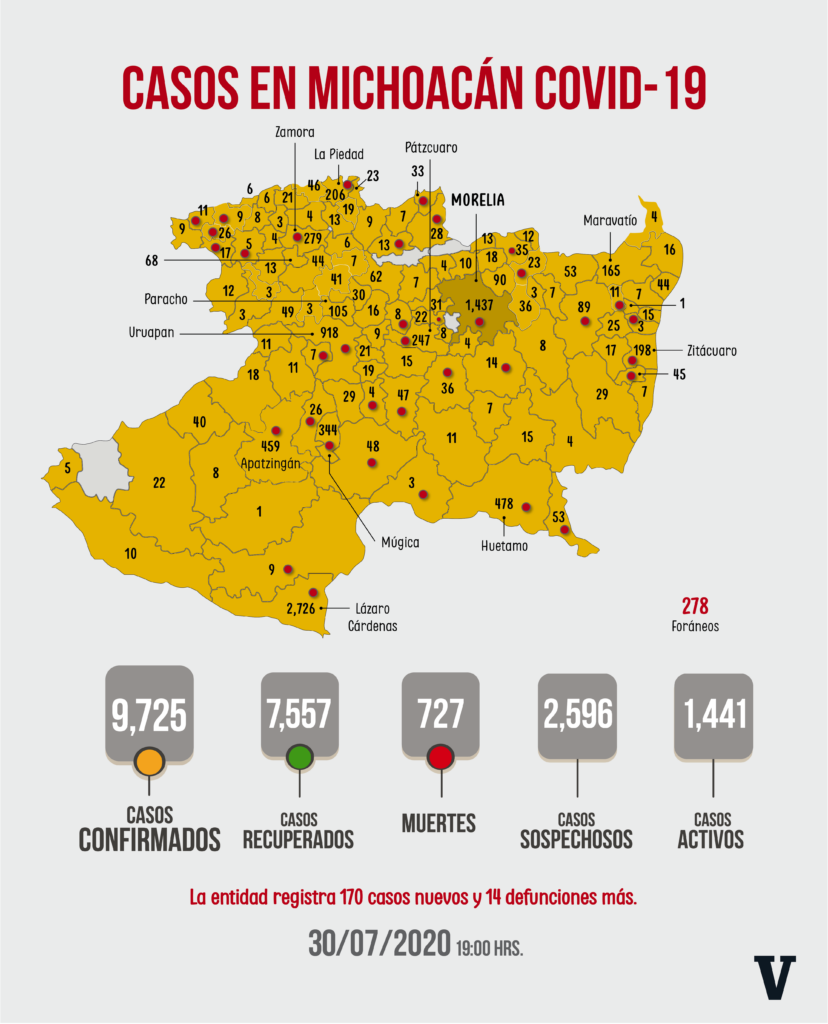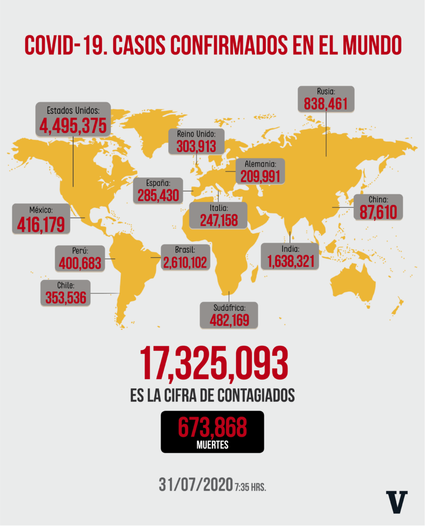 Enrique Santiago / La Voz de Michoacán Morelia, Michoacán La pandemia de COVID-19 mantiene en vilo al mundo. Tres naciones rebasan el millón de casos: en primer lugar se mantiene EUA, con 4,495,375, le sigue Brasil con 2,610,102 y en tercer lugar, India con 1,638,321. Te presentamos un panorama global actualizado al 31 de julio de 2020 sobre el comportamiento del COVID-19. Fuente: Johns Hopkins University of Medicine. Diseño: Enrique Santiago, La Voz de Michoacán. El cúmulo de contagios en el mundo sigue al alza, suman 270 mil 274 casos en un solo día. En Estados Unidos de ayer a hoy hubo casi 67 mil 882 nuevos casos. Fuente: Dirección General de Epidemiología de la Ssa. Diseño: Enrique Santiago La Voz de Michoacán. En México aumentan los casos aún de manera alarmante y constante, los estados de Guanajuato, Veracruz y Tabasco ya sobrepasaron los 20 mil contagios acumulados y en total la nación ya tiene acumula 416 mil 179 personas contagiadas. Fuente: Centro Estatal de Operaciones COVID-19 de la SSM. Diseño: Enrique Santiago,La Voz de Michoacán. Michoacán alcanzó los 9 mil 725 contagios. En el último día, Lázaro Cárdenas ya volvió a sumar nuevos casos. Los cinco municipios que más acumularon contagios son Morelia, con 53; Uruapan, con 30; Lázaro Cárdenas presentó 20; Pátzcuaro tuvo 11 y Zacapu acumuló 10 nuevos casos.