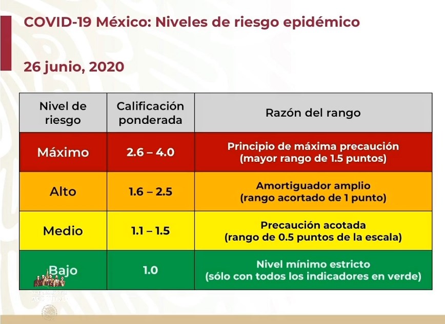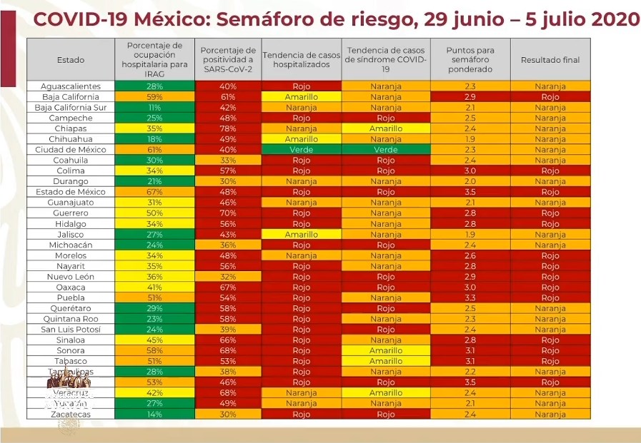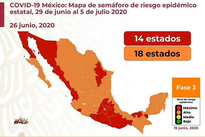 Redacción / La Voz de Michoacán Ciudad de México. La próxima semana 18 entidades federativas estarán en color naranja, es decir riesgo alto, y 14 permanecerán en rojo o riesgo máximo, informó el director general de Promoción de la Salud, Ricardo Cortés Alcalá, al presentar el semáforo general por entidad federativa para COVID-19 para la semana del 29 de junio al 5 de julio. Chiapas, Querétaro y Ciudad de México transitaron a semáforo naranja, mientras que Colima, Hidalgo y Nuevo León que estaban en este tono, regresaron a color rojo, es decir al máximo riesgo de contagio. Los 18 estados que a partir del lunes estarán en color naranja y que podrán retomar actividades no permitidas como un aforo de 50 por ciento en gimnasios, spa, albercas y centros deportivos así como 25 por ciento de aforo en cines, teatros, museos y eventos culturales son: AguascalientesBaja California SurCampecheCoahuilaChiapasChihuahuaCiudad de MéxicoDurangoGuanajuatoJaliscoMichoacánQuerétaroQuintana Roo,San Luis PotosíTamaulipasVeracruzYucatánZacatecas Mientras que los estos que permanecerán en rojo, y con ello una restricción de actividades, son: Baja CaliforniaColimaGuerreroHidalgoEstado de MéxicoMorelosNayaritNuevo LeónOaxacaPueblaSinaloaSonoraTabascoTlaxcala El funcionario reiteró que en semáforo naranja la ocupación hotelera puede tener 50 por ciento de aforo, con una utilización áreas comunes en el mismo porcentaje. Los restaurantes, cafeterías podrán abrir, siempre y cuando mantengan el 50 por ciento de su capacidad y tomando todas las medidas de higiene y sana distancia. Los supermercados y mercados pueden aumentar su capacidad hasta un 70 por ciento.