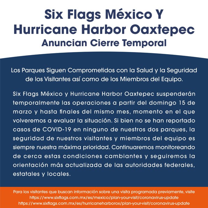 Ciudad de México. Six Flags México y Hurricane Harbor Oaxtepec anunciaron este sábado que suspenderán temporalmente las operaciones a partir de este domingo 15 de marzo.