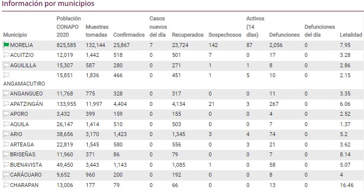 Jorge Ávila / La Voz de Michoacán Morelia, Michoacán. Este domingo han cambiado los colores de las banderas en el semáforo epidemiológico estatal, quedando sólo Morelia en bandera verde, por lo que los otros 112 municipios del estado ya están en color blanco. Al día de hoy, Morelia suma un acumulado de 25 mil 867 contagios de COVID-19, de los que 23 mil 724 ya se recuperaron y 2 mil 056 fallecieron. Además, hay en la capital del estado 142 personas sospechosas de portar el virus y 87 se consideran casos activos, esto al haber sido detectados en los últimos 14 días. En las últimas 24 horas, 12 habitantes de Michoacán fueron confirmados como positivos a coronavirus en 4 municipios, de acuerdo con el informe epidemiológico de la Secretaría de Salud sobre el avance de la epidemia en el estado. En el último día no se reportaron muertes por COVID-19, por cuarta vez desde que inició la epidemia en el estado, hace más de 20 meses. De los contagios detectados hasta el último corte, 7 fueron en Morelia, otros 3 en Juárez, un contagio más Zitácuaro y otro más en Zamora. Desde que el virus SARS-CoV-2 llegó a la entidad, en marzo del año pasado, 120 mil 199 habitantes se han contagiado, la mayoría de ellos de entre 20-29 y 30-39 años, pues con más de 51 mil casos confirmados, ambos grupos de edad aglutinan 43 por ciento de las personas infectadas. La enfermedad de la COVID-19 ha cobrado la vida de 8 mil personas en la entidad, principalmente en los municipios de Morelia, Uruapan y Lázaro Cárdenas, pues en conjunto concentran 43 por ciento de las defunciones. La mayoría de las personas que murieron por COVID-19 tenían más de 50 años, pues representan 83 por ciento de los fallecimientos; de ellos, el grupo de entre 60 y 69 años es el que más decesos presenta, con 2 mil 203 casos. Hasta ahora, 111 mil 949 personas han superado el padecimiento, es decir, 93 por ciento de todos los casos positivos en Michoacán, sin embargo, la Secretaría de Salud todavía reporta 250 casos activos que mantienen con vida la epidemia local, además de 678 sospechosos de los cuales no se tiene un diagnóstico.