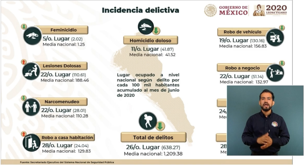Culiacán. Luis Cresencio Sandoval,  secretario de la Defensa Nacional, destacó que en Sinaloa hay un ligero incremento en los delitos de lesiones dolosas y robo a casa habitación, pero en feminicidios y homicidios dolosos y robo, una reducción de la incidencia.