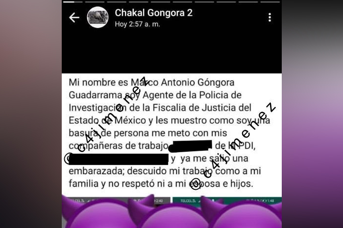 Redacción / La Voz de Michoacán Ciudad de México. Un comandante de la Fiscalía General de Justicia de la Ciudad de México es investigado por Asuntos Internos de la institución debido a que desde su celular se difundió contenido íntimo de tres compañeras de trabajo. Se trata del agente Marco A. Góngora Guadarrama, quien presuntamente almacenaba en su teléfono móvil el material y que fue filtrado. Una de las fotos divulgadas fue acompañada con la leyenda: “Hace buenas chambas mi compañerita”. Sin embargo, el señalado culpó a su esposa de la difusión, porque le descubrió lo que tenía guardado en el celular. Las fotos y videos que se hicieron públicos, atribuidas al usuario Chakal Gongora 2, también tenían parte de este mensaje, presuntamente escrito por la esposa: “Mi nombre es Marco Antonio Góngora Guadarrama. Soy Agente de la Policía de Investigación de la Fiscalía de Justicia del Estado de México y les muestro cómo soy una basura de persona. Me meto con mis compañeras de trabajo (ilegible) de la PDI, (ilegible) y ya me salió una embarazada; descuido mi trabajo, como a mi familia y no respeto ni a mi esposa e hijos”. Según el periodista Carlos Jiménez, el mando presume estar protegido dentro de la Fiscalía y que nada le sucederá. Si las afectadas presentan una denuncia y de comprobarse el delito bajo el amparo de la Ley Olimpia, Marco A. Góngora enfrentaría una pena de tres a seis años de cárcel, además de multas que irían de las 500 a 1,000 Unidades de Medida y Actualización (UMAS). Esto dice la Ley Olimpia: Comete el delito de violación a la intimidad sexual, aquella persona que divulgue, comparta, distribuya o publique imágenes, videos o audios de contenido íntimo sexual de una persona que tenga la mayoría de edad, sin su consentimiento, su aprobación o su autorización”. ... videograbe, audiograbe, fotografíe, imprima o elabore imágenes, audios o videos con contenido íntimo sexual de una persona que tenga la mayoría de edad, sin su consentimiento, su aprobación o su autorización”.