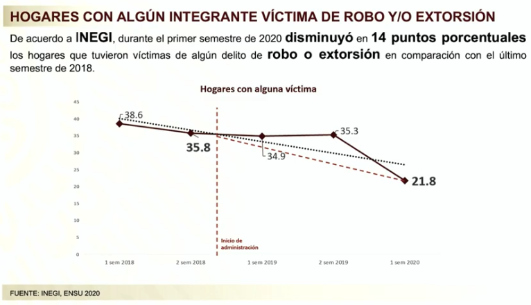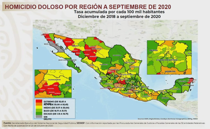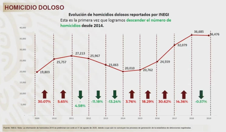 EFE / La Voz de Michoacán México registró en septiembre un descenso del 8,4% mensual en el número de homicidios dolosos al registrar 2.729 respecto a los 2.979 de agosto, según informó este miércoles el secretario de Seguridad y Protección Ciudadana, Alfonso Durazo. "Llevamos dos meses a la baja. Del mes de septiembre a agosto hay una baja exacta de 250 homicidios, cifra relevante que es inferior 8,4% respecto al mes de agosto", anunció el funcionario en conferencia de prensa junto al presidente del país, Andrés Manuel López Obrador. Durazo abrió su informe de seguridad con el anuncio de que sería el último. "En mi caso será el último informe", dijo el todavía funcionario, que aspiraría a la candidatura del partido Movimiento Regeneración Nacional (Morena) a la gobernación de Sonora. El secretario aseguró que el Gobierno ha logrado un punto de inflexión. "Mantenemos la línea de contención", pues según los datos, este delito suma dos meses a la baja. https://www.youtube.com/watch?v=aZfX_bPYufk Además, señaló que en lo que corresponde a homicidios dolosos se logró romper con la tendencia al alza de los últimos cuatro años. Detalló que del 2015 al 2016 el delito de homicidio doloso se incrementó 18%; del 2016-2017, 30%, del 2017 al 2018 14 % y del 2018 al 2019, hay un a ligera baja del 0,57 %. Lo importante es que hay un quiebre y que logramos romper esta inercia de cuatro años", indicó el secretario y subrayó que son cifras del Instituto Nacional de Estadística y Geografía (Inegi). Estas cifras difieren de las que ofrece mensualmente el Secretariado Ejecutivo de Seguridad Pública, y contabilizan más asesinatos en 2019 que en el año anterior. Detalló que Tijuana, Zacatecas, Guanajuato "están en zona roja" y aclaró que Quintana Roo también aparece en rojo pero "tiene una población flotante de 11 millones de personas al año, aunque sigue siendo la entidad con más homicidios". Destacó el caso de Guanajuato, donde en septiembre bajaron los homicidios un 8,29 % y lo atribuyó a la captura el pasado junio del líder del Cártel Santa Rosa de Lima, José Yépez Ortiz, conocido como el Marro. Señaló que la estrategia que han aplicado "está dando resultados de manera progresiva" y aseguró que el problema de la inseguridad no se va a resolver de un día para otro. Se equivoca quien pretenda que sea en esos términos; sin embargo, hemos logrado una baja sostenida, progresiva, permanente, que nos va a regresar la paz y la tranquilidad", comentó. Otros delitos En cuanto a los feminicidios, el secretario indicó que hubo un incremento de 1,8 % pues pasaron de 77 en agosto a 78 en septiembre. A pesar de esto, Durazo afirmó que la "tendencia histórica" de crecimiento de feminicidios se ha desacelerado. Los secuestros aumentaron de 87 en agosto a 90 en septiembre, mientras que los robos subieron de 49.519 a 50.165. No obstante, en el periodo enero-septiembre, estos dos delitos han marcado reducciones importantes de más del 20 %. El secretario informó que en lo que va del año se han congelado 13.328 cuentas bancarias vinculadas a la delincuencia organizada equivalentes a 7.697 millones de pesos (unos 365 millones de dólares).