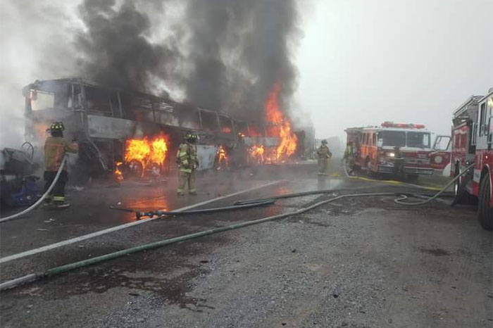 Redacción / La Voz de Michoacán México. Un fuerte accidente se registró esta mañana en la autopista San Luis Potosí-Querétaro, en el que se vieron involucrados varios vehículos, entre ellos, un autobús que transportaba aficionados del club Monterrey que se dirigían a la Ciudad de México para apoyar al equipo regiomontano en el encuentro contra el América. El percance ocurrió a la altura del kilómetro 94, en el municipio de San Luis de la Paz, Guanajuato, donde también participaron otro autobús y cuatro camiones pesados. Uno de los tráileres iba cargado con 28 metros cúbicos de azufre y otro, doble, remolque, transportaba 67 mil de diésel. https://twitter.com/Pedro_GuerreroG/status/1457071430076669957?s=20 Según los reportes, tras el impacto por alcance, el vehículo de los seguidores de los Rayados se incendió. De acuerdo a los cuerpos de auxilio, no hubo víctimas mortales y en el lugar fueron atendidas 47 personas, sin lesiones de gravedad. El partido entre América y Monterrey se llevará a cabo este sábado en punto de las 19:00 horas en el estadio Azteca. https://twitter.com/LaPandillaMX/status/1457075500975861762?s=20 https://twitter.com/ALBERTO_DAVALOS/status/1457073683063791623?s=20