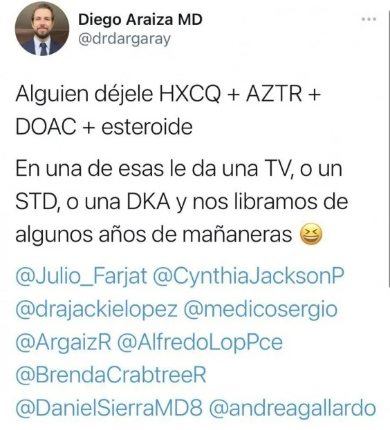El pasado domingo, luego que el mandatario federal anunciara que había dado positivo a COVID, el médico pidió en su cuenta de Twitter: “Alguien déjele HXCQ + AZTR + DOAC + esteroide. En una de esas le da una TV, o un STD o una DKA y nos libramos de algunos años de mañaneras".