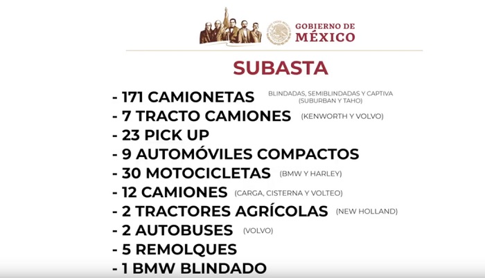 Omar Cuiriz / La Voz de Michoacán Ciudad de México. El presidente de México anunció este día que el 23 y 24 de febrero se llevará a cabo un tianguis donde subastará motos, camionetas, autos Audi, Mercedes, BMW, etcétera. Informó que el aeropuerto de Santa Lucía será el lugar donde se llevará a cabo la feria de automóviles que en sexenios pasados estaban disponibles para el uso de altos funcionarios. Durante su conferencia matutina mostró un video con los vehículos disponibles y puso un ejemplo una camioneta que su costo original fue de 6 millones de peosos y ahora se venderá en menos a de dos millones. “Es una línea fifi” bromeó el presidente. “Línea machuchona”, como mencionó el presidente es otro ejemplo de una camioneta que originalmente costó 4 millones. Queremos obtener alrededor de 100 millones, que serán para la Guardia Nacional. Y el 26 y 27 de abril se pondrán en venta 76 aviones y helicópteros también en Santa Lucia. Dijo que recibió un “Gobierno faraónico” en donde el director del Infonavit, por ejemplo, ganaba 700 mil pesos mensuales. Recordó que los fondos para su Gobierno saldrán también de la política de austeridad que está llevando a cabo. Recordó que los fondos para su Gobierno saldrán también de la política de austeridad que está llevando a cabo.