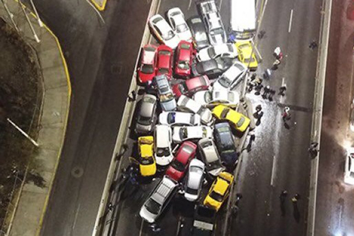Redacción/La Voz de Michoacán Coahuila. Debido al Frente Frío número 23 que congeló el pavimento y la falta de precaución de un automovilista, en el puente de Luis Echeverría a la altura del boulevard Nazario, se registró una mega-carambola en la que participaron 43 vehículos, la policía municipal reportó cuatro personas lesionadas, no de gravedad. En la capital de Coahuila la temperatura en este momento oscila entre los 5 y 6 grados centígrados bajo cero. El Gobierno Estatal activó el Plan de Contingencias por Bajas Temperaturas. El percance, según datos preliminares, se debió a que un automóvil que era conducido a velocidad inmoderada derrapó y provocó la coalición de carros, camionetas, una patrulla de la policía municipal y un camión de transporte. Los daños son multimillonarios, porque algunos autos y camionetas son último modelo, aunque no se han podido cuantificar el daño, porque peritos de las aseguradoras tardan en evaluarlos, debido a lo complicado percance. La carambola se registró anoche, paramédicos de la Cruz Roja atendieron a los lesionados y agentes de la Policía Municipal coordinados por el director de la corporación, capitán Hugo Eduardo Gutiérrez Rodríguez, desviaron el tráfico por vías alternas y acordonaron el área. Debido a que se reportaron otros accidentes y por instrucciones del alcalde, Manolo Jiménez Salinas, cerraron ese paso vehicular de “El Sarape” y todos los demás puentes de la ciudad, porque están cubiertos por una capa de hielo. Hasta las primeras horas de este miércoles, aún no se han podido mover muchos de los autos chocados, ya que los dueños o conductores esperan que la policía termine los croquis del accidente, para que los peritos de las aseguradoras puedan intervenir y hacer su trabajo de modo que calculen a cuanto equivalen los daños y ordenen la reparación o indemnización. Sólo algunos pudieron ser retirados, y los demás esperarán la orden para que los muevan las grúas y los lleven al corralón, a los talleres de las agencias o con algún mecánico. Con información de El Universal...