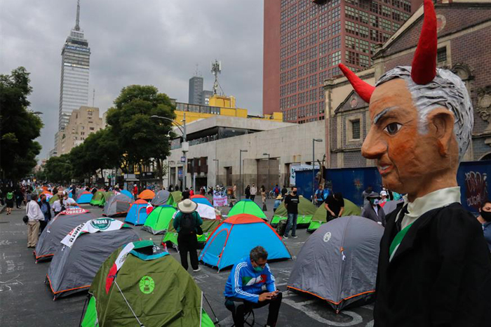 EFE / La Voz de Michoacán Desde este sábado, alrededor de unas mil 500 personas afines al Frente Nacional Anti-AMLO (FRENAAA) iniciaron un protesta en la Ciudad de México e instalaron un plantón de cientos de casas de campaña frente al Palacio de Bellas Artes luego de que la policía les impidió llegar al Zócalo de Ciudad de México. Al respecto, esta mañana el presidente de México aseguró que garantizará la libertad de expresión y no molestará a sus opositores, pero pidió a sus dirigentes, a “los meros, meros”, que se sumen al plantón y se queden a dormir ahí, no en hoteles. “Ahora que hay un plantón en el centro de la Ciudad de México, cosa que hicimos nosotros durante mucho tiempo luchando por la justicia y la democracia, ellos deben saber que tienen todas las garantías para manifestarse, que no serán molestados, que se van a poder quedar ahí en sus casas de campaña, como nosotros lo hicimos”, dijo AMLO durante la supervisión sobre la reconstrucción a tres años del sismo del 19 de septiembre. “Ojalá y se queden un tiempo suficiente, que no sea nada más efímero, unos cuantos días, nosotros nos quedamos ahí varias veces, hasta más de un mes. No estoy llamando a que se vayan a acampar todos al Zócalo, pero es interesante que ellos vivan este proceso", agregó. Las casas de campaña se extendieron a lo largo de la céntrica Avenida Juárez, entre Paseo de la Reforma y el Palacio de Bellas Artes, al no poder llegar a la Plaza Central en su protesta contra el gobierno del presidente Andrés Manuel López Obrador (Amlo). Convocado por el Frente Nacional Anti AMLO (Frena), esta protesta forma parte de las acciones contra el Gobierno de López Obrador de esta organización formada por 67 grupos, y que en los últimos meses ha celebrado protestas con vehículos en varias ciudades del país. La protesta se inició en el Monumento a la Revolución, que está cercano al Paseo de la Reforma y se detuvo en el Palacio de Bellas Artes, ante lo que denunciaron como un cerco policíaco que les impidió seguir avanzando. Frena convocó a través de las redes sociales a que sus seguidores marcharan y ocuparan este sábado la plaza del Zócalo de manera indefinida hasta que se de la renuncia del presidente López Obrador a su cargo. Este movimiento ha acusado al gobierno de López Obrador de represión en el caso de la toma de la presa La Boquilla en el Estado de Chihuahua, de haber ocupado militarmente y de manera autoritaria la Catedral Metropolitana de Ciudad de México. Asimismo de tener un pésimo manejo de la salud pública de la pandemia que ha dejado más de 72.000 muertos, de haber pauperizado la economía del país y actos de corrupción. "Somos ciudadanos de a pie y no tenemos a nadie detrás, pero estamos conscientes de que la única forma de evitar esta dictadura que se está instaurando en el país es hacer que todos los mexicanos salgamos de nuestra zona de confort y nos unamos", señalaron. "Hasta que se vaya: ya no queremos que esté", declaró Andrés, líder de jóvenes por México en Puebla y participante en la protesta de las casas de campaña. El coordinador de Frena en Puebla, Jesús Rodríguez, recordó que sus movimientos pretenden hacer conciencia entre los mexicanos y unirse a favor de su petición de que López Obrador dimita a la presidencia. "Es lo único que estamos pidiendo. ¿Por qué razón? Por los resultados nefastos que tenemos en estos dos años de gobierno", denunció Rodríguez.