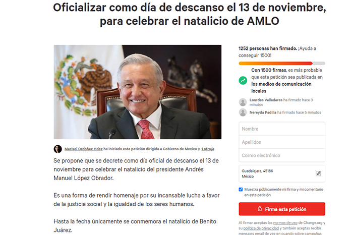 Redacción / La Voz de Michoacán México. Que el pueblo decida, quite y ponga si no está de acuerdo…, ha sido la máxima de Andrés Manuel López Obrador, y ya está en puerta la consulta promovida por él sobre la Revocación de Mandato el próximo 10 de abril. En este tenor, una simpatizante de López Obrador ha lanzado también una consulta para que un día de noviembre sea declarado de asueto. La mujer, identificada como Marisol Ordoñez Hdz, propuso en la plataforma change.org que se decrete como día oficial el 13 de ese mes, para celebrar el natalicio del presidente de México. La usuaria pretende con ello que se rinda homenaje a AMLO por “su incansable lucha a favor de la justicia social y la igualdad de los seres humanos”, ya que hasta la fecha el único natalicio que se celebra es el de Benito Juárez, argumenta la promotora de recolección de firmas. Aunque la petición se lanzó hace 4 meses, al mediodía de este sábado 26 de marzo lleva acumuladas mil 255 firmas, de las cuales, mil se agregaron durante las últimas 13 horas, de acuerdo con el sitio. Change.org especifica que si se superan las mil 500 firmas, las peticiones pueden viralizarse por los diferentes canales de comunicación.
