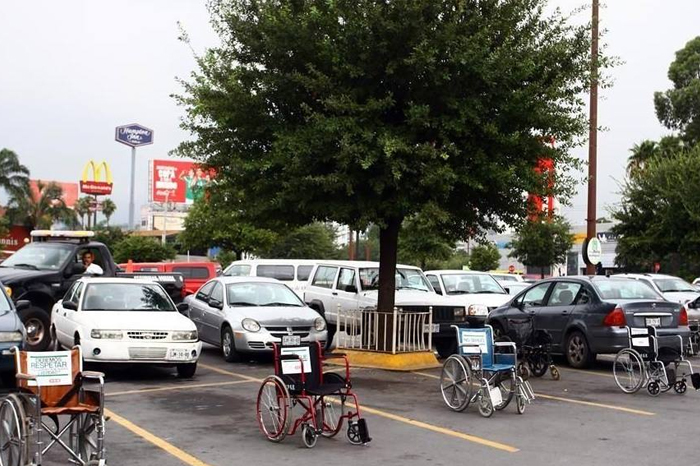 Redacción / La Voz de Michoacán Nuevo León. Automovilistas se toparon con algo nunca antes visto en una plaza comercial de Monterrey. En el estacionamiento de la tienda HEB de la colonia Gonzalitos hubo caras de sorpresa y enojo por este hecho insólito, Resulta que 20 lugares de un corredor de este estacionamiento fueron ocupados por sillas de ruedas vacías con letreros con frases como: "Al cabo nadie lo usa", "No tardo", ¡Ay, no me fije!" y "Estoy esperando a alguien". La actividad duró de 12:00 a 13:00 horas y fue organizada por el Consejo Estatal para Personas con Discapacidad de Nuevo León, que agrupa a asociaciones que apoyan a personas con discapacidad.