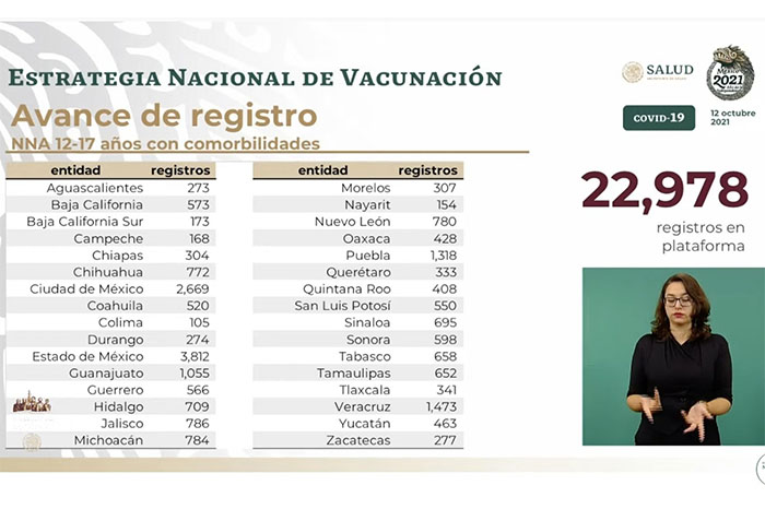 Redacción / La Voz de Michoacán Ciudad de México. Con tres semanas de haberse abierto el registro para vacunar contra COVID-19 a niñas, niños y adolescentes de 12 a 17 años con comorbilidades, se han recibido casi 23 mil solicitudes, apenas un 1.5% de la población contemplada de este segmento. Hugo López-Gatell, subsecretario de Prevención y Promoción de la Salud del gobierno federal, detalló que a la fecha se han registrado 22,978 menores que tienen enfermedades crónicas; sin embargo, se espera una población estimada de entre un millón y millón y medio. El encargado de informar sobre la pandemia en México exhortó a que se registren quienes estén en esta condición de salud que aumenta el riesgo de padecer COVID-19 grave en caso de contagio. DE MICHOACÁN YA HAY APUNTADOS Sobre el avance del registro, del Estado de México se ha recibido el mayor número, con 3,812, y de Michoacán se han apuntado 784 menores de 12 a 17 años con comorbilidades. Con más de mil registros también se encuentran la Ciudad de México (2,669), Veracruz (1,473), Puebla (1,318) y Guanajuato (1,055). Y el estado de Colima es que el que a la fecha tiene el menor número de registros, con 105. ¿QUIÉNES DEBEN VACUNARSE? Si el familiar menor de edad tiene las siguientes comorbilidades, es importante que se registre para que reciba la vacuna. • Inmunosupresión (cáncer, trasplantes, VIH, etc.)• Enfermedad pulmonar crónica grave• Afecciones crónicas del riñón, hígado o sistema digestivo• Enfermedad neurológica crónica• Enfermedades cardiovasculares• Diabetes y otras enfermedades endocrinológicas (incluye obesidad grado 2 o mayor).• Anomalías genéticas o cromosómicas • Embarazo adolescente. Registra AQUÍ a la niña, niño y adolescente con alguna comorbilidad.