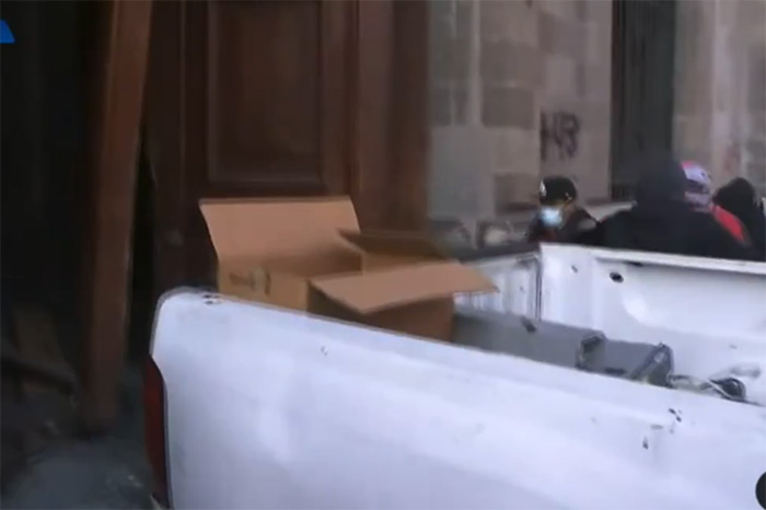 Morelia, Michoacán. La mañana de este miércoles, mientras el presidente de México, Andrés Manuel López Obrador, un grupo de normalistas derribó con una camioneta de la Comisición Federal de Electricidad (CFE) una de las puertas de Palacio Nacional, en la capital del país.