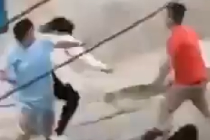 Redacción / La Voz de Michoacán Estado de México. Una pelea donde primero hubo de por medio palos y varillas, terminó a machetazos, con una mujer tirada en el suelo que recibió varios golpes con esta arma por parte de un enardecido sujeto. Este evento, presuntamente entre familiares que se disputan una casa en la colonia las Huertas, de Naucalpan, Estado de México, fue captado en video, donde se observa a un grupo de mujeres y hombres, y hasta perros, involucrados en la trifulca. Pero de los palos de escoba pasaron a los machetes. Una de las mujeres se enfrasca con un adulto mayor con las armas punzocortantes en las manos. Luego, un joven de playera naranja entra a un domicilio y sale también con una herramienta similar y reparte machetazos a quien se le pone enfrente, sobre todo a la mujer que yace tirada en el suelo, que recibe un brutal golpe cerca de la cabeza. Al lugar acudieron elementos de seguridad a atender el pleito, así como cuerpos de auxilio para brindar atención médica a los lesionados. https://twitter.com/ENMINEZA/status/1391600505181413378?s=20