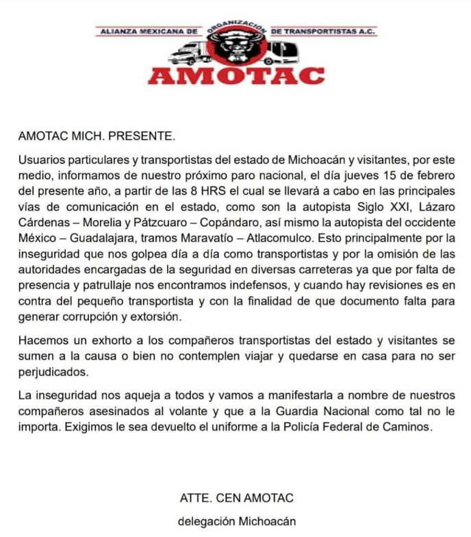 Redacción / La Voz de Michoacán Morelia, Michoacán. Con la exigencia de que las autoridades resuelvan el tema de inseguridad, transportistas anuncian un nuevo paro nacional en diversas carreteras del país. A través de un comunicado, la Alianza Mexicana de Organización de Transportistas A.C. (Amotac) acusó que “la autoridades que representan la seguridad y el buen funcionamiento del autotransporte federal, así como los gobiernos municipales y estatales involucrados” han incumplido en la solucionar el tema. ¿CUÁNDO ES LA MANIFESTACIÓN? La manifestación está programada para el próximo jueves 15 de febrero, a partir de las 08:00 horas en diversos puntos del territorio nacional. ¿EN QUÉ CARRETERAS DE MICHOACÁN SE MANIFESTARÁN? De acuerdo con la Amotac, la protesta en Michoacán se llevará a cabo en la autopista Siglo XXI: Lázaro Cárdenas-Morelia y Pátzcuaro-Copándaro. Asimismo en la de Occidente México-Guadalajara, tramos Maravío-Atlacomulco. Se hace el exhorto a los transportistas del estado y visitantes a que se sumen a la causa o bien, no viajen y se queden en casa para no ser perjudicados. ¿QUÉ DEMANDAN? “Ya no queremos más abrazos, sino que realmente e tomen acciones de inteligencia para abatir el tema de la inseguridad”, se lee en el comunicado. Consideran que es necesario que el gobierno garantice la seguridad de los operadores y del transporte en general que utiliza las vías de la comunicación. También piden la prohibición del vehículo doblemente articulado tipo tanque y regulación del parque vehicular (peso, velocidad cumplimiento de especificaciones). Además, el emplacamiemiento por parte de la Secretaría de Infraestructura, Comunicaciones y Transportes (SICT) para los vehículos de carga y turismo de modelo atrasado, así como tarifas oficiales de operación para el transporte de carga. Asimismo, urgen la reclasificación de carreteras a fin de proteger a los usuarios de las mismas, y que el reglamento de grúa se aplique de manera tajante en el ámbito estatal y federal. Otro de los puntos del pliego petitorio es que no están de acuerdo ni dispuestos a pagar un permiso municipal por el simple hecho de realizar su trabajo. Finalmente, exigen el cese de abusos y extorsiones por parte de elementos de las diferentes corporaciones policiacas de los tres órdenes de gobierno, además de la devolución de las carreteras federales que algunos gobiernos convenientemente las hicieron de cuota. “Agradecemos las muestras de respaldo de la sociedad y del gremio transportista, ya que el transporte mexicano necesita una solución. No es posible que a través de los años y los cambios de gobierno sigamos con estos vicios de chantaje y corrupción. El transportista sigue siendo considerado la caja chica de las autoridades”, así concluye el comunicado.