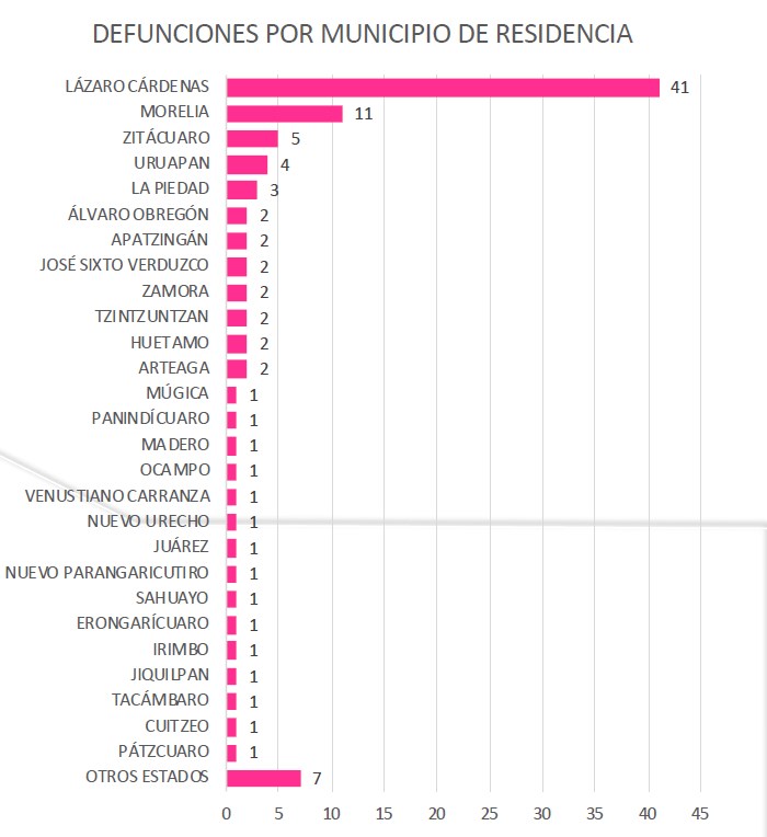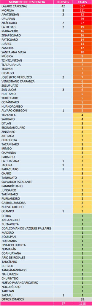 La Voz de Michoacán te da a conocer todas las nochesel último reporte de la Secretaría de Salud. Osiris Olachea / La Voz de Michoacán Morelia, Michoacán. En las últimas 24 horas se registraron 112 casos nuevos de COVID-19 en Michoacán, de los cuales 45 se reportaron por la mañana, mientras que 67 más se notificaron esta noche, de acuerdo con el informe dado a conocer hoy por el gobierno del estado. Hoy también se notificaron 4 defunciones más en el estado: una en Apatzingán, otra en Morelia, una en Nuevo Parangaricutiro y otra más en Zitácuaro, mientras que 22 personas más se sobrepusieron a la enfermedad y suman ya 394 recuperados en total. De acuerdo con los reportes matutino y vespertino que emitió hoy la Secretaría de Salud en Michoacán, los casos nuevos registrados en el último día son: Municipio de residenciaCasos nuevosCasos acumuladosLázaro Cárdenas73577Morelia10111Apatzingán352Uruapan139Zitácuaro627La Piedad219Zinapécuaro116José Sixto Verduzco27Tuxpan17Hidalgo17San Lucas36Álvaro Obregón15La Huacana13Jacona13Parácuaro13Charo23Ocampo12Zacapu11Otros estados139 Lázaro Cárdenas continúa como el municipio con más casos, con más de la mitad de las personas que han dado positivo a la prueba de detección del coroanvirus, además de que suma 41 decesos, de acuerdo con los informes de las autoridades sanitarias encargadas de la atención a la epidemia en Michoacán. Zacapu es el más reciente de los municipios en sumarse a la lista de demarcaciones michoacanas con contagios. Fuente: Departamento de Epidemiología de la Secretaría de Salud. Diseño: La Voz de Michoacán. Los municipios que hasta ahora han registrado habitantes con la enfermedad de COVID-19 en Michoacán son: Hasta hoy 50 pacientes permanecen hospitalizados por alguna complicación de la enfermedad de COVID-19, de los cuales 29 se encuentran en estado de gravedad; 45 son atendidos en hospitales públicos y 5 en privados. De todas las personas que se han infectado con la nueva cepa de coronavirus, 670 son hombres y 448 mujeres. En el último día se practicaron 204 pruebas de detección del virus, con lo que suman 4 mil 585 personas analizadas en total, de las cuales 649 continúan como sospechosos, mientras que 2 mil 818 han dado negativo, descartando que tengan coronavirus. La tasa de letalidad de la enfermedad bajó a 8.9 por ciento, de 9.5 por ciento que reportó ayer la Secretaría de Salud. Fuente: Dirección General de Epidemiología. Diseño: La Voz de Michoacán.