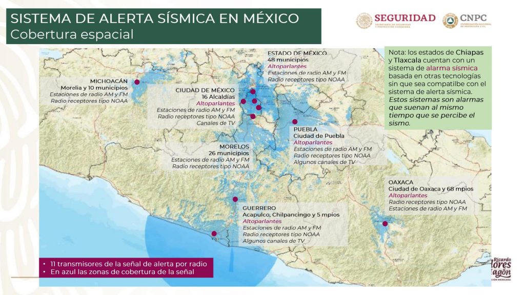Este sistema, detalló, cuenta principalmente con sensores que registran sismos de magnitud 5 hacia adelante en la costa desde Jalisco a Oaxaca. El algoritmo desarrollado emite la alerta a la Ciudad de México, Estado de México, Guerrero, Michoacán, Morelos, Oaxaca y Puebla, zona con mayor número e intensidad de movimientos telúricos.
