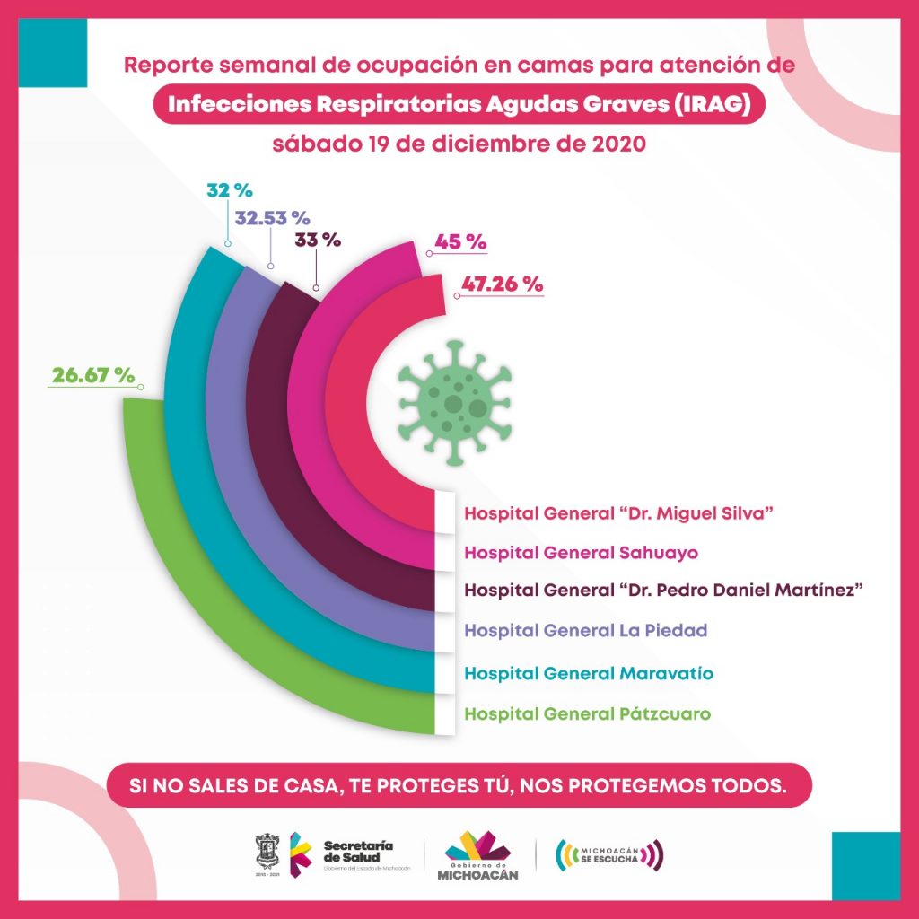 Redacción / La Voz de Michoacán Morelia, Michoacán. La Secretaría de Salud de Michoacán (SSM) reportó que las camas de seis hospitales reconvertidos para la atención de Infecciones Respiratorias Agudas Graves (IRAG), derivado del comportamiento epidemiológico por COVID-19, se encuentran entre 47.26 a 26.67 por ciento. El nosocomio que mayor demanda registra es el general, “Dr. Miguel Silva”, en Morelia con 47.26 por ciento de ocupación, cuando hace una semana registró 40.51 por ciento. Sigue el Hospital General de Sahuayo, que tiene 45 por ciento de sus camas ocupadas, cuando hace 7 días registró 30 por ciento. El Hospital General “Pedro Daniel Martínez” de Uruapan tiene ocupadas 33 por ciento de sus camas reconvertidas, una disminución de casi 5 por ciento en comparación con la ocupación que reportó el 12 de diciembre, que fue de 37.8 por ciento. El Hospital General de La Piedad tiene hoy ocupadas 32.53 por ciento de sus camas para pacientes con COVID-19, y la semana anterior tuvo 29.45 por ciento. En Pátzcuaro, la ocupación en el Hospital General es de 26.67 por ciento, menor al 30 por ciento que reportó la semana pasada. Ante estos casos, la SSM destacó la importancia de que la población extreme las medidas sanitarias preventivas durante esta temporada decembrina, para romper la cadena de contagio y evitar colapsar los nosocomios debido a la transmisión sostenida de COVID-19 en la entidad. En caso de realizar actividades esenciales es necesario mantener la distancia de por lo menos un metro y medio entre personas, el constante lavado o desinfección de manos. No tocarse la cara con las manos sucias también es de suma importancia, ya que el virus entra al sistema a través de la mucosa de ojos, nariz y boca. El quedarse en casa, así como el uso del cubrebocas son fundamentales para evitar la propagación del virus en la entidad y con esto preservar la salud y la vida de la población, donde la corresponsabilidad social es fundamental. La institución pone a disposición de la ciudadanía el 800-123-2890 con 11 líneas para resolver todas sus dudas, así como el micrositio bit.ly/MichCOVID-19, donde encontrarán toda la información disponible sobre COVID-19.