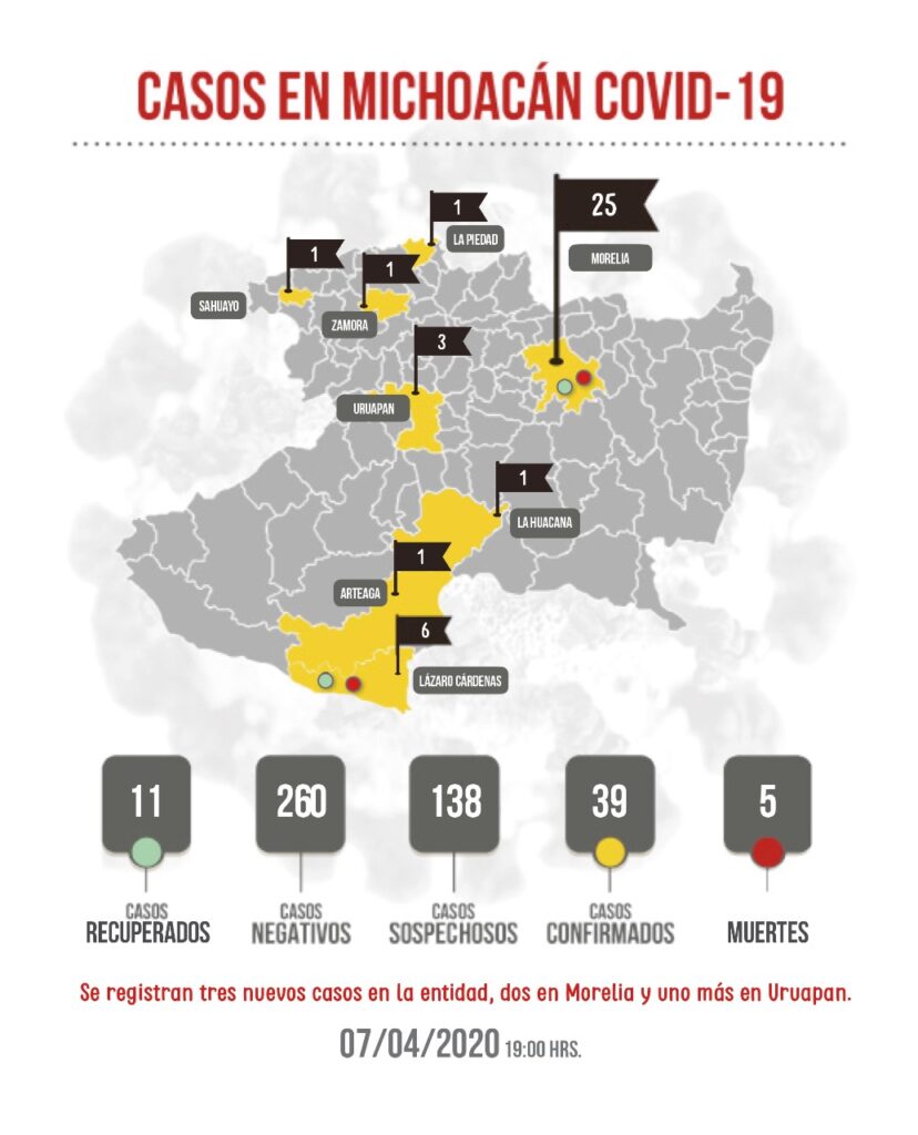 Osiris Olachea / La Voz de Michoacán Morelia, Michoacán. Con tres contagios más en las últimas 24 horas, en Michoacán se registran 39 casos confirmados de COVID-19 hasta este martes, mientras que las defunciones se mantienen en 5, de acuerdo con el informe que emitió hoy el Comité Estatal de Seguridad en Salud. Hasta el momento los casos positivos al virus del SARS-CoV-2, el cual produce la enfermedad de COVID-19, se confirmaron en Morelia (25), Zamora (1), Uruapan (3), La Piedad (1), Sahuayo (1), La Huacana (1), Arteaga (1) y Lázaro Cárdenas (6). Fuente: Comité Estatal de Seguridad en Salud. Diseño: Enrique Santiago. En la entidad hay al momento 138 casos sospechosos en diferentes municipios, mientras que 260 han dado negativo a las pruebas, de un total de 437 personas a las que se les han practicado estudios. El número de personas que se han recuperado a la enfermedad de COVID-19 en el estado se mantiene en 11. De los 39 casos conformados con el nuevo virus, 23 son hombres y 16 mujeres; de todos estos, 26 fueron importados, 5 personas se contagiaron por brote familiar y 8 en segunda generación. Por grupos de edad, el que registra más contagios es el de entre 60 y 69 años con 11 casos (6 mujeres y 5 hombres), seguido de entre 50 y 59 años con 9 pacientes (2 mujeres y 7 hombres). La persona más joven en el estado en dar positivo al nuevo virus en un niño menor a 10 años de edad, seguido de 2 mujeres y un hombre de entre 20 y 29 años. Entre los 30 y 39 años hay 5 hombres contagiados, y entre los 40 y 49 hay 3 mujeres y 2 hombres. La persona de mayor edad en contraer el nuevo coronavirus es una mujer mayor a 80 años, así como cuatro personas entre 70 y 79 años (2 mujeres y 2 hombres). Los síntomas que ha presentado la mayoría de las personas positivas al virus son tos (en 36 de los 39 casos), dolor de cabeza (29 personas) y fiebre (28 pacientes). Después siguen escalofríos, dolor muscular y de articulaciones, dificultad para respirar, dolor de pecho, congestión nasal, irritabilidad, dolor al tragar, diarrea y dolor abdominal. Las comorbilidades más frecuentes, es decir las enfermedades ya presentes en los pacientes que pueden agravar su estado de salud, son obesidad, diabetes, hipertensión, tabaquismo y asma. Hasta ahora, las autoridades estatales han atendido 1,532 llamadas de michoacanos sobre dudas o para pedir información sobre el coronavirus, de las cuales 10 por ciento se recibieron al 911 y 90 por ciento al 800 123 2890, línea dispuesta por el gobierno del estado para este fin.