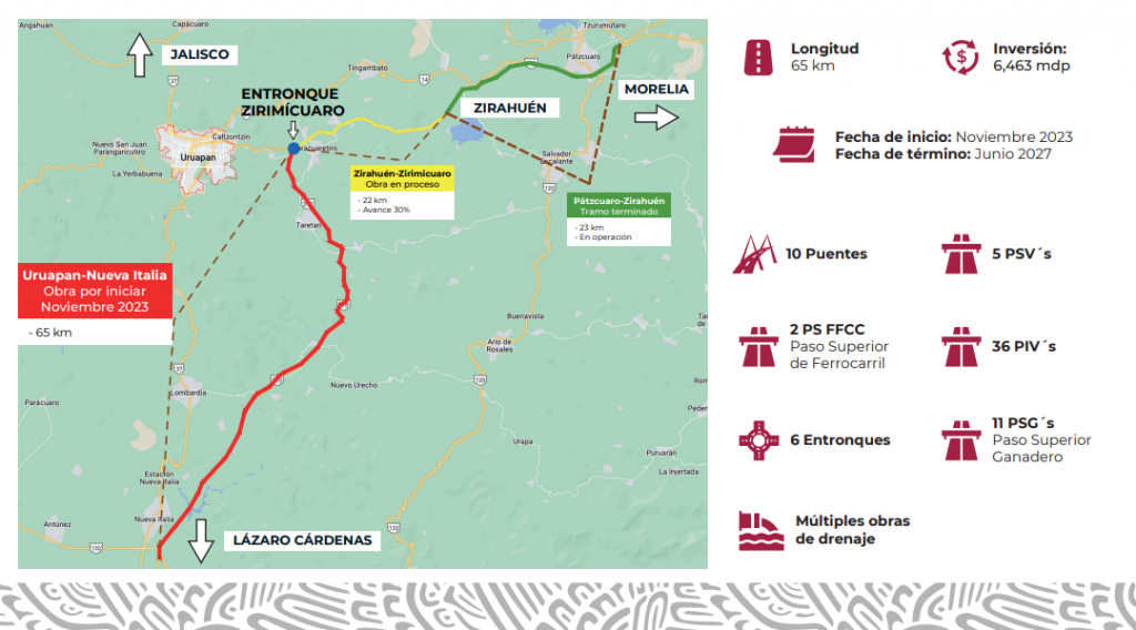 Redacción / La Voz de Michoacán Morelia, Michoacán. Con una inversión cien por ciento federal, por el orden de los 6 mil 400 millones de pesos, este viernes el titular de la Secretaría de Infraestructura, Comunicaciones y Transportes (SICT), Jorge Nuño Lara, y el gobernador del estado, Alfredo Ramírez Bedolla, dieron el banderazo a las obras de ampliación a cuatro carriles del tramo Uruapan-Nueva Italia, de la autopista Siglo XXI. La obra, cuya conclusión está prevista para junio de 2027, implica 64 kilómetros de longitud que generará 640 fuentes de empleo directas y mil 600 indirectas, y con beneficio para 679 mil habitantes. Además, una vez concluida, el tiempo de recorrido en este tramo se reducirá de 50 a 30 minutos. La SICT, en su ficha técnica del proyecto, también destaca como bondades el impulso al desarrollo de la actividad económica y social de la región; aumento de su capacidad y nivel de servicio, pasando de nivel D al A; incremento de la capacidad de movimiento de carga de productos locales a diferentes puntos de distribución, así como el mejoramiento de su conectividad con los estados de Guanajuato, Querétaro, Jalisco, Estado de México y la Ciudad de México. Jorge Nuño manifestó que, de origen, se actuó de forma urgente en cuanto a tramitología para iniciar con la ampliación que abarcará hasta Lázaro Cárdenas, debido al incremento de la capacidad comercial del puerto michoacano, así como a los accidentes viales que ocurren en dicha vialidad. Aclaró que se trata una segunda etapa, porque ya se empezó una en junio de este año, de Pátzcuaro a Uruapan, tramo Zirahuén, que consta de 22 kilómetros. “Con gente comprometida y con pasión, vamos a poder lograr este tipo de infraestructura que es para el bien de México”, dijo el funcionario federal. Por su parte, el mandatario estatal, Alfredo Ramírez Bedolla, compartió que esta carretera “es una de las columnas vertebrales” para el nuevo tratado comercial entre México, Estados Unidos y Canadá (T-MEC). “Esta autopista es importante para la comercialización de productos agrícolas como el aguacate, el limón y la toronja, que tienen gran demanda en mercados internacionales”, agregó.
