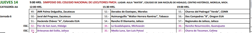 Redacción/ La Voz de Michoacán Morelia, Michoacán. Para este jueves la fiesta charra continúa en la capital michoacana, y en su jornada 6 tendrá a grandes jinetes de la Categoría AA sobre ruedo. Pero desde temprana hora comenzará la actividad del Congreso y Campeonato Nacional Charro, con el Simposio del Colegio Nacional de Locutores FMCH, en el Aula "Mater" del Colegio de San Nicolás de Hidalgo, en el Centro Histórico de Morelia, la cita es las 9:00 horas. Mientras que en el Pabellón Don Vasco, la fiesta inicia a las 12:00 horas con: Palma Delgadita, Zacatecas; Dorados de Oaxtepec, Morelos; Charros del Pedregal "Verde", CDMX; Jaral del Progreso, Zacatecas; y Huimanguillo "Walter Herrera Ramírez", Tabasco. A las 15:30 horas competirán: Dos Compadres "B", Oregon EUA; Hacienda Chávez "A", Colorado EUA; Rancho El Diamante, Jalisco; Regionales de Jalisco, Jalisco; y Flor de San Juan, Hidalgo. Para las 19:00 horas se prevé la participación de: La Guadalupana, Michoacán; Rancho Resurrección, Guanajuato; Artesanas del Exilio, Jalisco; Media Luna, San Luis Potosí y el equipo Charra de Tecoman, Colima