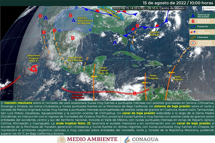 El clima previsto se debe a un canal de baja presión extendido a lo largo de la Sierra Madre Occidental, en interacción con el ingreso de humedad del Océano Pacífico.