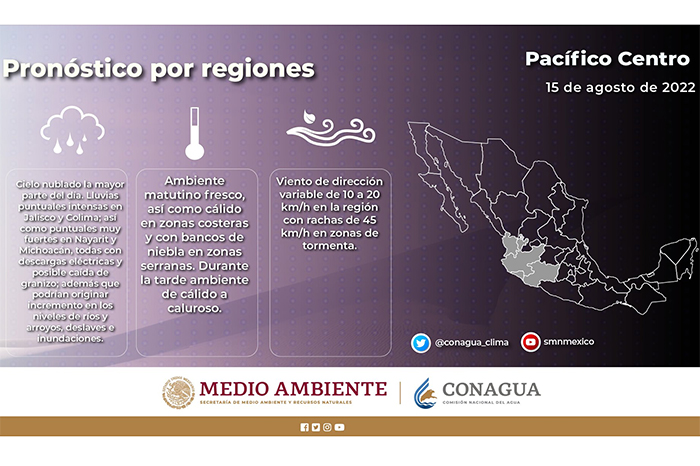 Morelia, Michoacán. Para este lunes 15 de agosto, la Comisión Nacional del Agua pronostica que lloverá fuerte en Michoacán y otras entidades de la región Pacífico Centro.