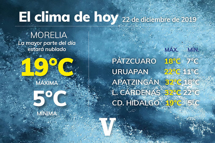 Michoacán. Parcialmente nublado durante el día y con una temperatura máxima de 19 grados es lo que vivirá este domingo la capital michoacana; además durante la tarde-noche se espera un marcado descenso de la temperatura desde las 19 horas, cuando el termómetro marcará 16 grados y descenderá paulatinamente hasta alcanzas los 5 grados.