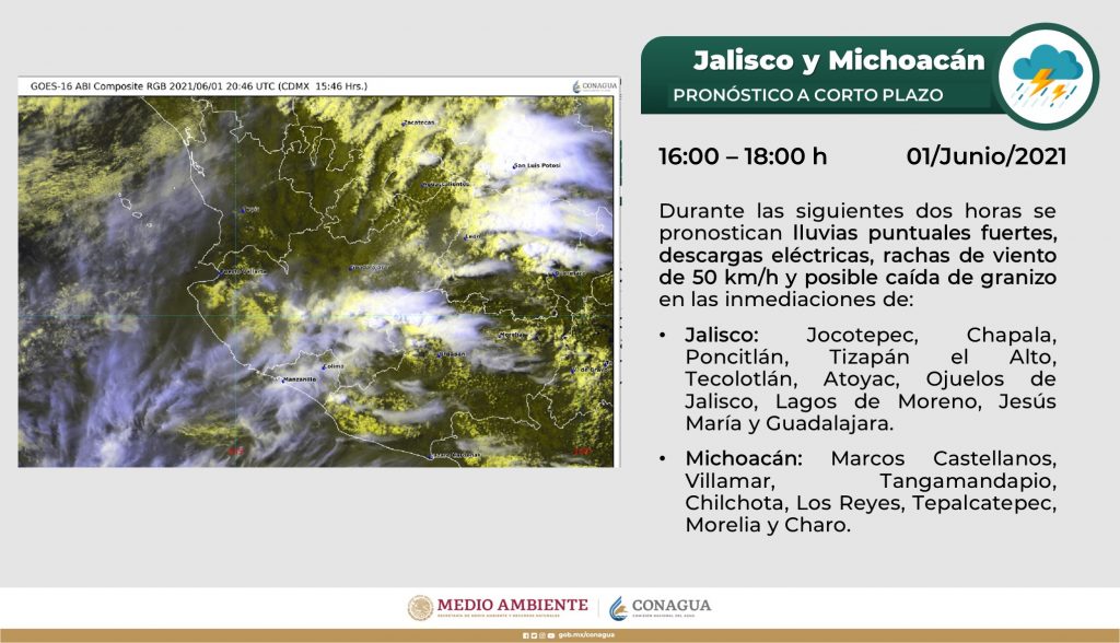 Muy fuertes en regiones del Estado de México, Guerrero y Morelos; fuertes en zonas de Chiapas, Chihuahua, Ciudad de México, Durango, Guanajuato, Jalisco, Michoacán, Querétaro y Veracruz; intervalos de chubascos en Aguascalientes, Colima, Hidalgo y Tlaxcala.