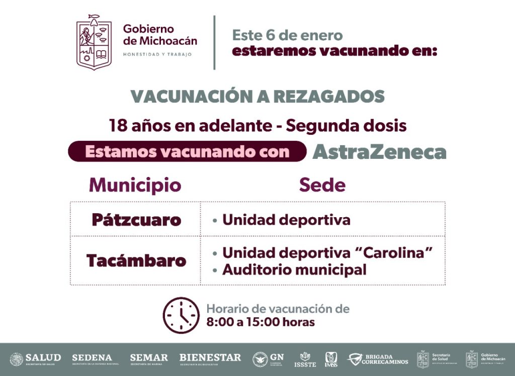 Redacción / La Voz de Michoacán Morelia, Michoacán. Este jueves 6 de enero continúa la jornada de vacunación anti COVID-19 para jóvenes de 15 a 17 años en Michoacán. Este día se vacunará a: Segunda dosis jóvenes de 12 a 17 años con comorbilidades en Lázaro CárdenasPrimera dosis menores de 14 a 15 años en 11 municipiosSegunda dosis jóvenes de 15 a 17 años en 34 municipiosSegunda dosis rezagados de 18 años en adelante en Pátzcuaro y Tacámbaro 12 A 17 AÑOS CON COMORBILIDADES Este jueves en Lázaro Cárdenas se aplicarán segundas dosis a jóvenes de 12 a 17 años con alguna comorbilidad, así como adolescentes de 12 a 17 años de edad y embarazadas con más de 9 semanas de gestación. La sede es el Hospital General de Zona No. 12 del IMSS, en la avenida Lázaro Cárdenas 154, colonia Centro. Algunas de las comorbilidades son: Condiciones cardíacas crónicasEnfermedad pulmonar crónicaAfecciones crónicas del riñón, hígado o sistema digestivoEnfermedad neurológica crónicaEnfermedades endócrinasInmunosupresión moderada a graveAsplenia o disfunción del bazo y enfermedades hematológicasAnomalías genéticas graves que afectan a varios sistemas El viernes 7 de enero será en Morelia la vacunación de segunda dosis a jóvenes de 12 a 17 años con comorbilidades, así como adolescentes de 17 a 17 años y embarazadas con más de 9 semanas de gestación. La sede será el nuevo Hospital Infantil, en Atapaneo. VACUNA 14 A 15 AÑOS Este jueves 6 de enero se aplicarán primeras dosis de la vacuna de Pfizer a adolescentes de 14 a 15 años en Cojumatlán, Cotija, Marcos Catellanos, Pajacuarán, Sahuayo, Tingüindín, Tocumbo, Nocupétaro, Zacapu, Aquila y Arteaga. A continuación las sedes de aplicación: VACUNA 15 A 17 AÑOS Este jueves 6 de enero se aplicarán segundas dosis de Pfizer a adolescentes de 15 a 17 años en 34 municipios de Michoacán. Es necesario llevar el expediente de vacunación impreso y prellenado que se puede descargar aquí: https://mivacuna.salud.gob.mx También deberán llevar acta de nacimiento y comprobante de domicilio, además de ir acompañados por un adulto, madre, padre o tutor, solo una persona, que a su vez deberá presentar su INE. Los municipios y sedes son: VACUNA A REZAGADOS Hoy también se aplicarán segundas dosis con AstraZeneca a rezagados de 18 años en adelante en Pátzcuaro y Tacámbaro, en horario de 8:00 a 15:00 horas. Las sedes son: Durante 2021 se aplicaron 194 mil 361 dosis de Pfizer, lo que representa la inmunización del 29 por ciento de jóvenes en ese rango de edad. A la par, se continúa con la aplicación del refuerzo a personal de salud de instituciones públicas; el biológico que se les administra es la AstraZeneca y en próximos días se iniciará el refuerzo para docentes michoacanos.