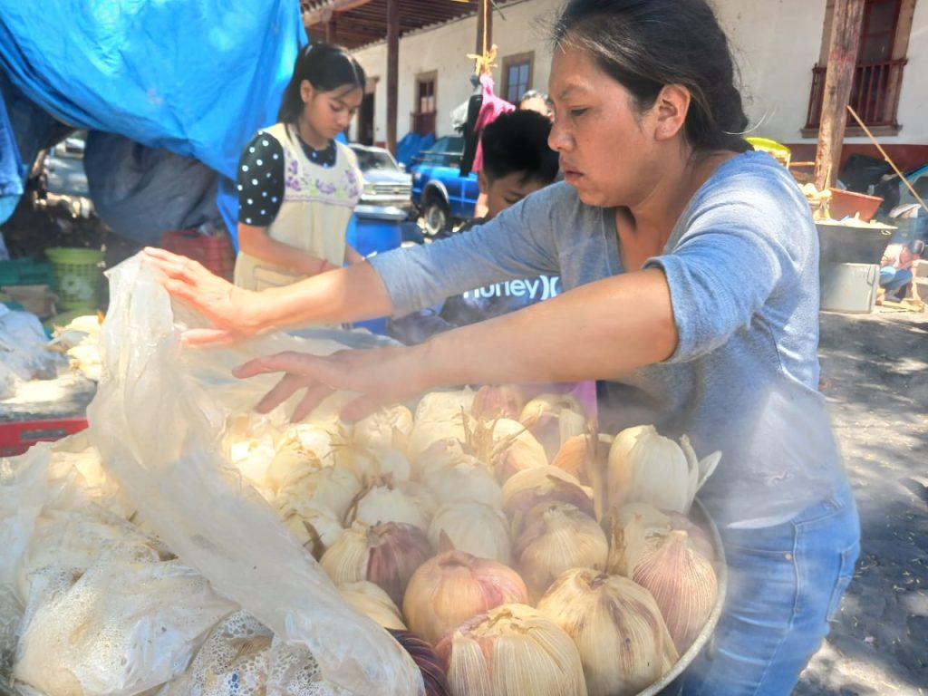 Angélica Ayala / Colaboradora La Voz de Michoacán Pátzcuaro, Michoacán.- En la plaza de San Francisco cada Semana Santa llegan las Chicaleras, provenientes de la comunidad indígena de Pichátaro. Aunque no hay una fecha exacta de cuándo inició esta tradición, se ha transmitido de una generación a otra, por al menos cien años, al haber testimonios de mujeres que recuerdan aprender hacer los chicales y los tamales de harina y de trigo, por sus abuelitas o mamá. En la plaza instalan sus fogones con tabiques sobrepuestos, en medio prenden el fuego con la madera y encima colocan las grandes tinas de metal donde cuecen los tamales, a un costado las ollas vaporeras burbujea el agua y el piloncillo donde se están cocinando las mazorcas de maíz, que al ablandarse se pueden consumir, es justamente los chicales, de ahí proviene el nombre de las chicaleras. Todas se colocan en fila, hacen las fogatas y empiezas a cocer los chicales, mientras tanto amansan la harina de trigo o natural, que mezclan con un poco de sal o azúcar y que después cuecen en tinas poniendo agua que se calienta con las llamas de la fogata, con el vapor se van cociendo la masa que está envuelta en una hoja de maíz. Cada quién en su lugar que por tradición les corresponde, empiezan a ordenar la leña para prenderla y empezar con la elaboración de los tamales de harina, la mezcla de la harina la sirven en una hoja de maíz, la envuelven bien y la dejan reposar unos momentos para después colocarlos en la tina o cazuela que previamente se calentó con el fuego y poca agua. El trabajo de la chicalera es arduo, primero tienen que colocar sus puestos, preparar la fogata y la tina donde cocerán los tamales, después mezclan la harina batiéndola a mano con fuerza y movimientos muy precisos, la dejan reposar un momento y colocan la masa en un par de hojas de maíz y la envuelven. A diario realizan poco más de 300 tamales, que se venden durante el día de elaboración, sin embargo, por la consistencia de la masa y el modo de cocción pueden venderlos al siguiente día. Sin embargo, este año una chicalera que por décadas ha participado en esta tradición, ahora es la excepción, doña Consuelo María Nicolás, Doña Chelo, como cariñosamente se le conoce no llegó a Pátzcuaro a instalar su puesto y vender sus chicales y tamales de harina. En el 2024, narró que tenía 95 años de edad, siempre atenta y amable, sus manos curtidas por la vida y llenas de tizne porque movía la madera, se le notaba siempre entusiasta por realizar esta tradición que heredó de sus ancestras. Doña Chelo, nos informaron las chicaleras, sufrió una caída y su estado de salud se ha deteriorado, de tal manera que este año no le permitió llegar a vender sus chicales, “sí sentimos feo de no verla aquí, de no tenerla entre nosotros, ojalá se recupere pronto, porque ahora que no vino ha de estar bien triste, siempre estaba presente y vendiendo sus tamales y chicales”, relató una de sus compañeras. “Pásale pásele ¿qué se va a llevar unos tamales o chicales”, expresan al momento de ver posibles clientes, “aquí tiene la prueba, pruébelos están bien buenos”, dice otra mientras extiende en una cuchara un pedazo de maíz cocido, “le damos tres por cincuenta o uno solo a veinte pesos”, los jóvenes que se acercaron lo pensaron y después de intercambiar miradas, se decidieron por llevar los tres tamales de harina por los cincuenta pesos, la chicalera los metió a una bolsa de plástico, le pagaron, se subieron a la moto y se fueron. Al llegar a la plaza San Francisco, se percibe un olor dulce, a harina y a piloncillo, a pesar del humo que por momentos rodea el lugar, las tinas con los tamales que tapan con una bolsa de plástico para que se cuecen “parejitos”. Mientras siguen envolviendo más tamales que colocan en tablones de madera, para en cuanto se vacié la tina, empiecen a coser los demás tamales, trabajo que realizarán durante las dos semanas que estarán ofreciendo esta gastronomía tan representativa de Semana Santa.