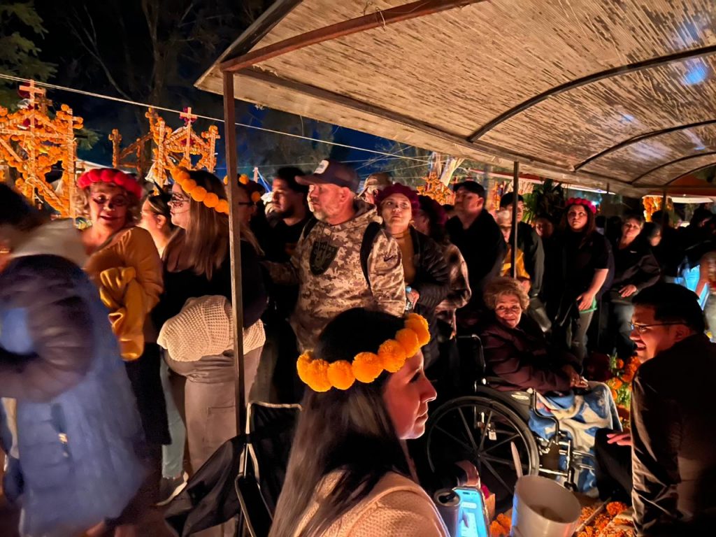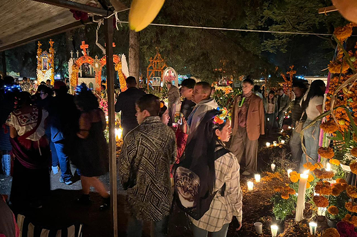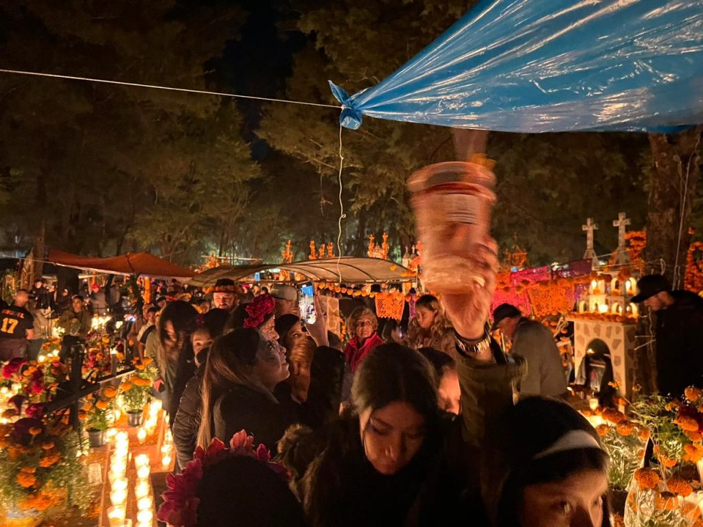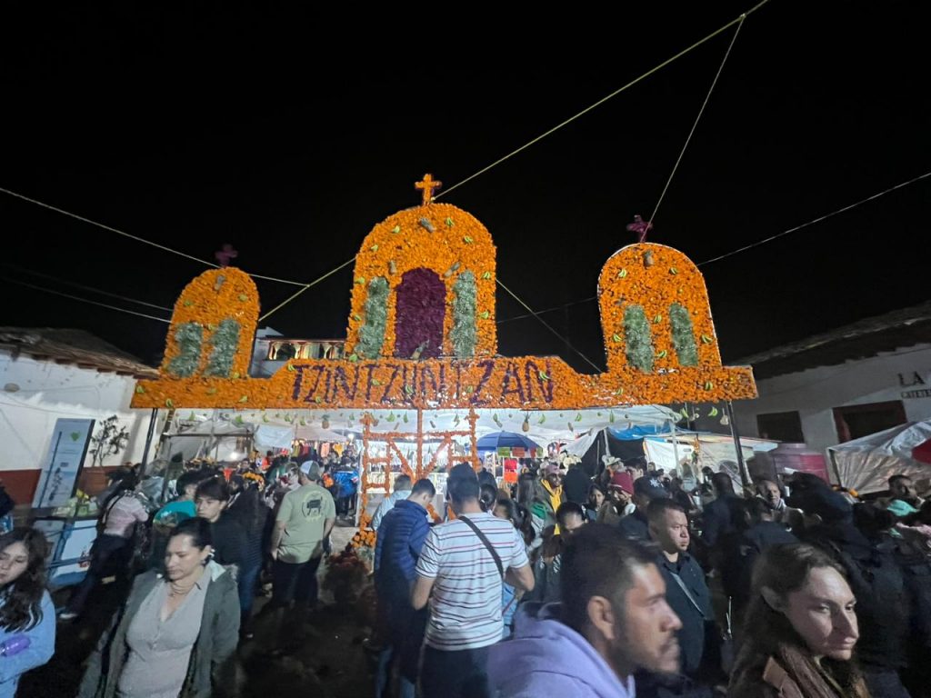 Omar Cuiriz / La Voz de Michoacán Tzintzuntzan, Michoacán. Decenas de autobuses y camionetas tipo van han desfilado desde el 30 de octubre por la carretera y caminos que conectan los pueblos purépechas, teniendo como puntos principales Pátzcuaro y Tzintzuntzan; este año se vieron llegar antes y en cantidades mayores de lo que usualmente se espera año con año. Los anuncios de agencias de viaje y que inundaron las redes sociales desde meses anteriores, promoviendo variedad de tours con todo tipo de costos, surtieron un efecto positivo en la demanda de visitantes locales de ciudades cercanas como Morelia y de otros estados como Ciudad de México, Querétaro; incluso, este medio de comunicación confirmó presencia de turistas de estado del norte como Monterrey. Foto: Omar Cuiriz, La Voz de Michoacán. Si bien es común el turismo europeo, llamó la atención este año la visita de grandes grupo de visitantes españoles, que junto a grupos de orientales casi igualaron al número de paisanos y estadounidenses. PUESTOS NO DAN ABASTO Lo anterior refleja el trabajo de promoción a gran escala realizado por las autoridades del estado, el cual obligó a ampliar las zonas de venta de antojitos como pozole batido; artesanías de barro brunido; ropa de invierno tejida y bebidas desde micheladas, café y atole de pinole. Foto: Omar Cuiriz, La Voz de Michoacán. Los puestos abarcaron este año más espacio en las calles y la avenida principal de Tzintzuntzan y apenas daban abasto a marchas forzadas a los miles de turistas que comían tacos, enchiladas, quesadillas, gorditas, incluso sopas instantáneas y pizzas. TZINTZUNTZAN, EL REINO PURÉPECHA La capital purépecha cuenta con alrededor de 15 mil habitantes, de acuerdo con datos oficiales de 2020, esta cantidad se multiplicó con creces este año que seguramente romperá un nuevo récord de visitantes, así como la derrama económica. Pese a los esfuerzos de las autoridades por una logística efectiva para hacer fluir a los miles de personas en un pueblo pequeño pueblo, poco se puede hacer en los dos panteones con los que se cuentan, pues apenas tienen un corto camino de piedra y luego hay que abrirse paso en entre las tumbas que cada vez quedan más juntas por los restos de los nuevos difuntos que se van sumando. Foto: Omar Cuiriz, La Voz de Michoacán. Este año, desde antes de mediodía del 31 de octubre y 1 de noviembre, oleadas de turistas saturaron los accesos e interiores de los panteones, los pobladores que velan a sus angelitos y familiares ya están acostumbrados a las multitudes y solo se pegan a las tumbadas para dejar pasar a los visitantes y sus accidentados pasos sobre el piso de tierra y piedras. NADA IRRUMPE LA LLEGADA DE LOS DIFUNTOS Ni las carcajadas, las pláticas en voz alta, ni las pisadas e invasión de tumbas para poder pasar, distraen la tradición antiquísima de velar a los muertos. Los habitantes de Tzintzuntzan siguen con fervor prendiendo veladoras que mantienen su luz toda la madrugada, colocando ofrendas generosas y forrando con las flores amarillas de cempasúchil. Foto: Omar Cuiriz, La Voz de Michoacán. Los rezos cada hora en los panteones durante toda la madrugada del 2 de noviembre, demuestran que esta tradición mantiene su esencia: la de honrar la vida de quienes amaron y ya no están con vida en esta tierra y confiar en que los visitan y son recibidos con una ofrenda al gusto. PROCESIÓN DE ARCOS Una de las tradiciones que más impactan y que ha comenzado a extenderse a otros lugares como la capital de Morelia, es la procesión de inmensos arcos forrados de flor y cargados por los familiares de los difuntos quienes danzan con él, otros cargan frutas y velas al ritmo de música de banda. Foto: Omar Cuiriz, La Voz de Michoacán. La corona, como también se le conoce a este arco, es llevado al Atrio de Los Olivos para que sea bendecido en una misa y posteriormente ser llevado a su tumba correspondiente en los panteones. La calle principal del pueblo es el escenario de este recorrido que llena al pueblo de incienso y que tan pronto culmina, es ocupado por cientos de admiradores. Foto: Omar Cuiriz, La Voz de Michoacán.