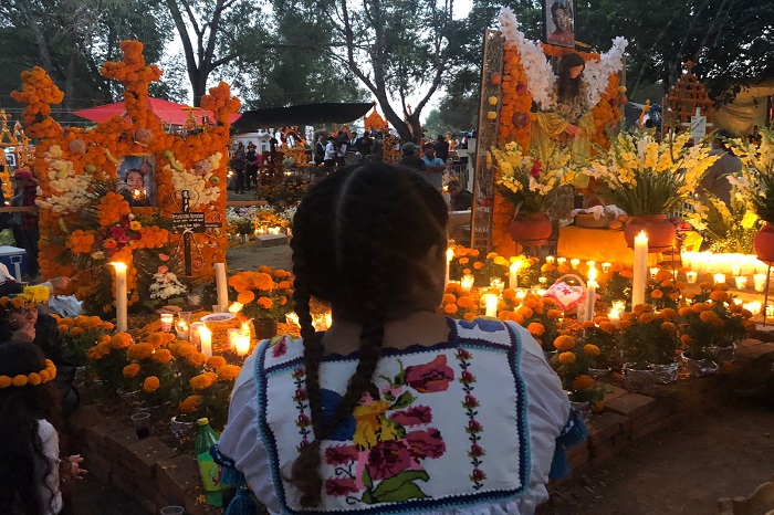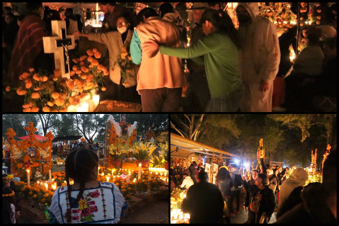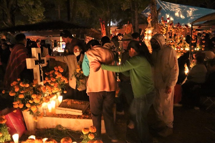 Omar Cuiriz / La Voz de Michoacán Tzintzuntzan, Michoacán. Ni la mercadotecnia, ni los puestos ambulantes, los ambiciosos proyectos turísticos o la falta de respeto de los visitantes, logran minimizar la tradición milenaria de velar a los seres queridos ya fallecidos. Aunque sea encogiéndose, ‘haciéndose chiquitos’ y siendo empujados por extranjeros, los habitantes de Tzintzuntzan siguen con fervor prendiendo veladoras que al ser pateadas se apagan, y continúan poniendo flores que fueron pisadas. Esta madrugada, la del 1 para el 2 de noviembre de 2022, el Día de Muertos en manos de pobladores sucede con fuerza, al igual que la diversión y curiosidad de miles y miles que se animaron a visitar el pequeño pueblo que tantas veces ha sido fotografiado y viralizado en redes sociales. Foto: Omar Cuiriz Probablemente este sea el año que más gente ha visitado Tzintzuntzan en un Día de Muertos. No hay un solo espacio del pequeño pueblo que no esté saturado de visitantes. Los ojos de asiáticos, franceses, estadounidenses y de miles de turistas del interior país se pusieron en el desfile de coronas que inicia en la entrada del pueblo hasta llegar a las tumbas de alguno de los dos panteones que tiene Tzintzuntzan. Un desfile, danzas, música, velas, ofrendas y un gran fervor por parte de los familiares y amigos del difunto. Este desfile que inicia a las cuatro de la tarde, es principalmente para los difuntos que apenas han muerto y celebraron su primer año de Día de Muertos. La corona, como se le conoce, ese adorno forrado de flor de cempasúchil y fruta, es bendecida en el Atrio de Los Olivos, y durante el desfile, quienes las cargan, danzan con ella al son de música típica. Video: Omar Cuiriz PLEITOS ENTRE VISITANTES Y POBLADORES Fue tanta la gente, que los familiares que pasan toda la madrugada velando, no podían sentarse a hacerlo. Algunos optaron por cerrar los centímetros de espacio que quedan entre tumbas, pero la reacción de turistas era retadora y hostil. -Estoy velando a mi muerto -dijo un habitante de Tzintzuntzán que puso una caja de cartón de veladoras para que no pisaran su tumba.-Y yo vengo a ver como lo hacen, soy turista –le respondió un visitante con la cara pintada. La cámara de La Voz de Michoacán captó cómo los turistas pasaban por encima de las tumbas. Al platicar con una mujer que realiza los rosarios con un micrófono durante toda la madrugada, consideró que “el turismo no es malo, no pedimos que no haya, pero no sólo no respetan sino que piensan que están dejando dinero a un pueblo de escasos recursos, pero no es así. La noche de muertos nunca ha sido un impacto para quienes mantienen viva esta tradición que da tanto orgullo”. “Si esta tradición llegó a todo el mundo, fue por las personas que adornan las tumbas significando cada cosa y que pasan toda la madrugada ahí, pero que ironía que vienen a contemplar eso y a la vez no permitan que se haga”, se quejó la mujer. La calle principal del pueblo es el escenario del recorrido que llena el pueblo de incienso y el aire de cuetes, miles y miles fueron testigos de esta arraigada costumbre que mantiene al estado y al país en la mira internacional. La tradición orgullosamente mexicana, se ha vuelto tan mediática en los últimos años, que pobladores confiesan que hacía mucho no habían “visto tanta gente” y que quizá “este año es el que más turistas han venido, no caben en el pueblo, menos en los panteones”, comenta una mujer que desde temprana hora está en la tumba de su marido. Foto: Omar Cuiriz Los panteones de Tzintzuntzan son los espacios donde más viva se siente la tradición de este día. La mayoría de las tumbas son cúmulos de tierra roja que este día se llenan de flores, veladoras y ofrendas, sin embargo, la multitud pasa por encima de ellas, tirando los adornos que honran la vida en la tierra del difunto. El gobierno preparó un operativo para intentar controlar el paso de los miles de visitantes y decenas de elementos de la Guardia Nacional, se ven rondando los panteones y calles, sin embargo, simplemente no se puede poner orden a una cifra [probablemente] récord de visitantes.