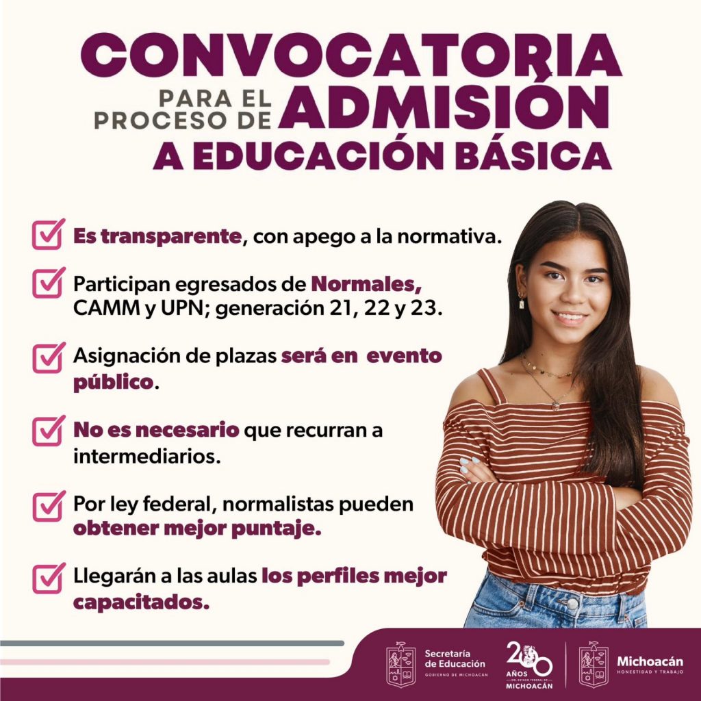 La autoridad educativa reitera que este proceso es totalmente personal, no se necesita de intermediarios y el trámite es gratuito; pueden participar normalistas de las generaciones 21, 22 y 23, así como egresados de la Universidad Pedagógica Nacional (UPN) y del Centro de Actualización del Magisterio en Michoacán (CAMM).